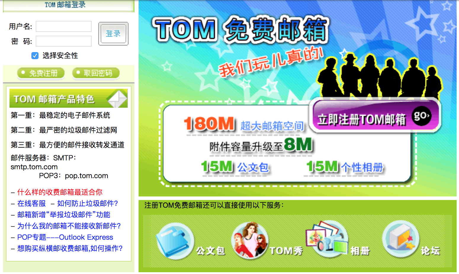 在 2000 年左右,那时候在国内最受欢迎的邮箱服务是 Tom 邮箱。这个在今天几乎已经被人遗忘的品牌,能在当年脱颖而出,凭借的是容量。在别的邮箱还是 10M 大小时,它率先推出了 100M 邮箱,随后又升级到了 1.5G,并支持 30M 的超大附件。