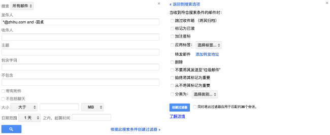 事实上,如果你打开 Gmail 网页版,会看到更复杂而全能的过滤器规则,也可以使用更复杂的搜索运算符。比如说,我想找出所有知乎发给我,但非「知乎圆桌」相关的邮件,就可以使用 * 通配符,from: *@zhihu.com 表示所有来自知乎的邮件,同时,发件人又不是「知乎圆桌」,只需要使用排除符号 -,就可以将发件人名称中带有「圆桌」两字的邮件去掉。