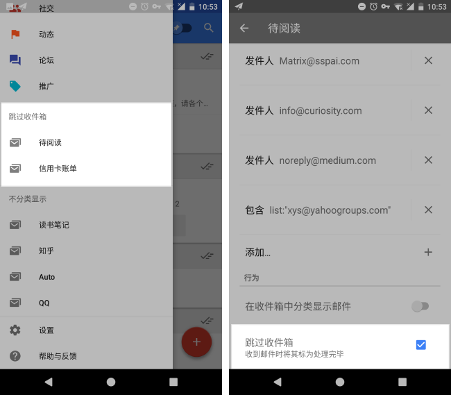 最常见的一个场景,莫过于邮件订阅。少数派、知乎日报、Instapaper、The Information 等服务和站点,都提供了邮件订阅。在正常的工作中,我不希望这些邮件随时进入收件箱侵占我的注意力,相反,针对这些阅读类的订阅邮件,我更喜欢在晚上找一个统一的时间段,一起阅读并做进一步处理。那么,当我收到这一类邮件时,我希望它们不出现在收件箱,而是自动被分配到「待阅读」这个标签下,等我有空时再统一打开去看。