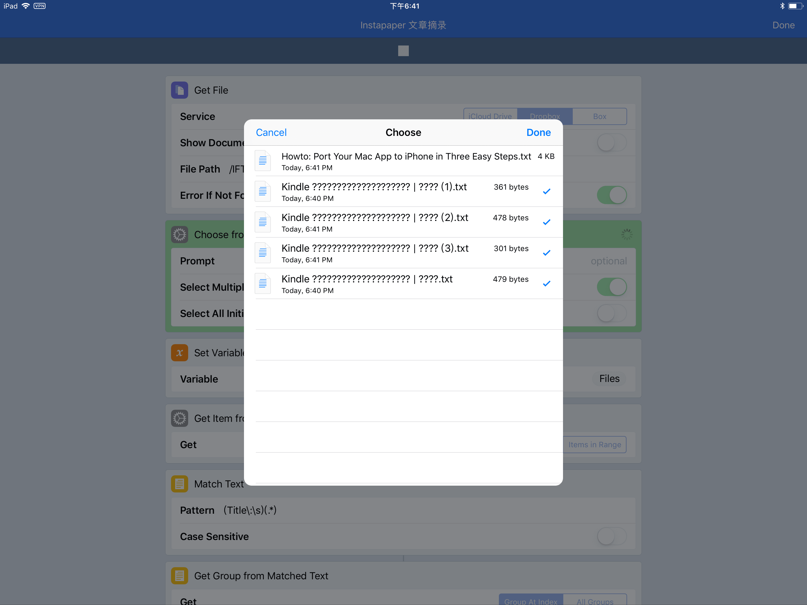 有几个地方需要说一下,第二步的 Choose from List 中我勾选了「Select Multiple」,虽然我们在 IFTTT 中选择了「Append」动作,即——如果存在同名文件,则保存至同一个文档。但有时候 IFTTT 会出一些差错,比如在遇到中文标题的时候,它可能会分别创建成几个文件。因此有时候会需要选择多个文档。
