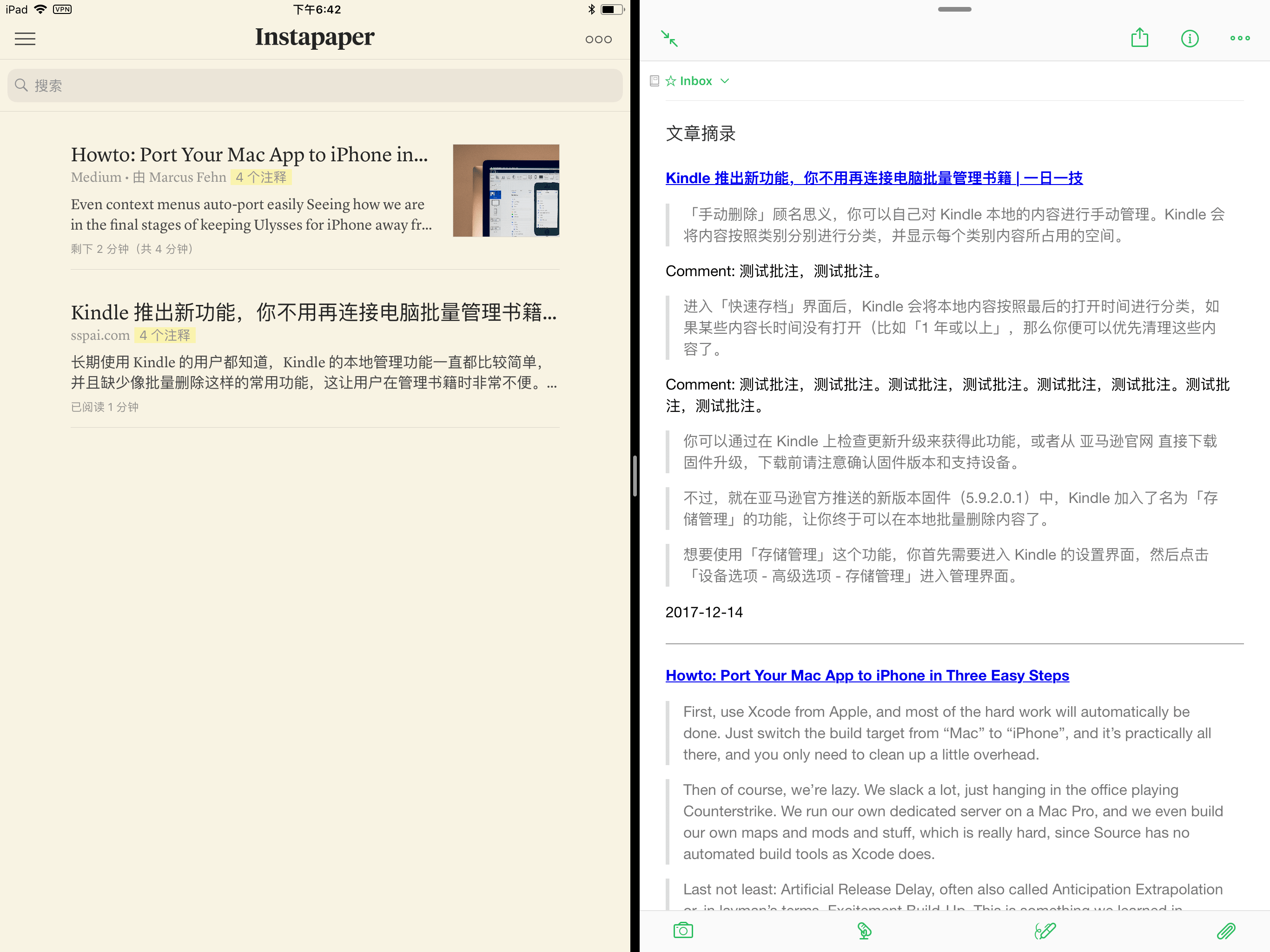 @speicalk:希望通过 Workflow 将 Instapaper 内文章的注释(Highlight)导入到印象笔记。现在是用 IFTTT 做这件事,优点是后台进行,不用管,缺点是单条导入,不能分文章导入,并且样式不好看。之前尝试过通过 Instapaper 显示注释,然后导入到 Bear,再套用样式,分享到 Evernote,效果不错,步骤较多,也就放弃了。不知道能否通过 Workflow 来实现。