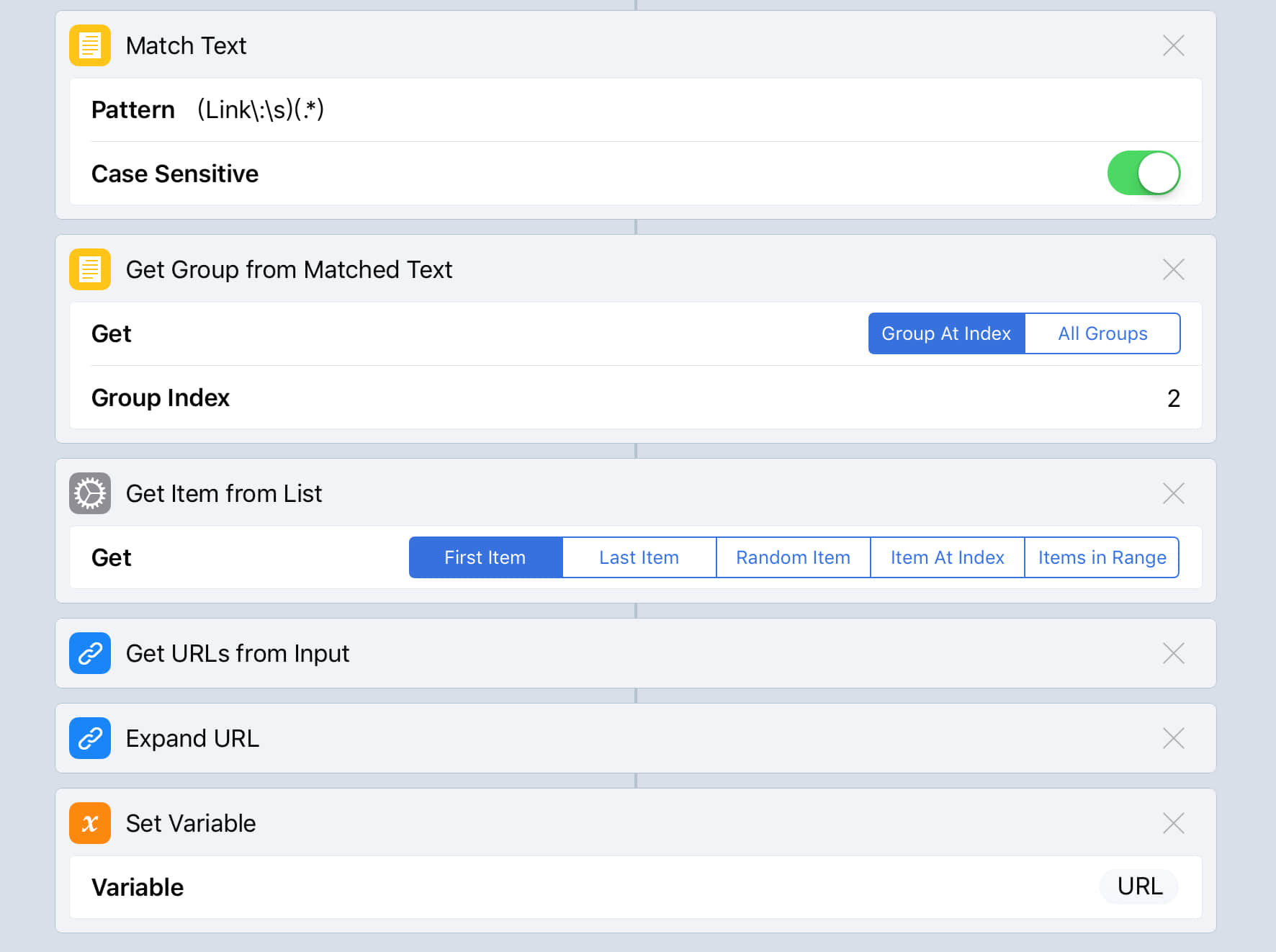 学习正则表达式并不难,你只需要花十来分钟把这个网站的开头看一下就行了,之后每次要用到再来查它具体的语法。总之正则表达式可以让搜索和匹配更灵活,并且在 Workflow 中也能节省一些步骤。 动作中用到的正则表达式,匹配以「Link: 」开头的链接