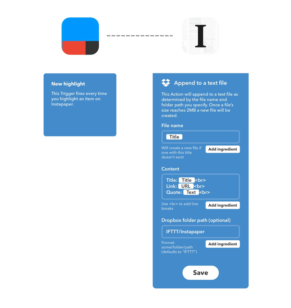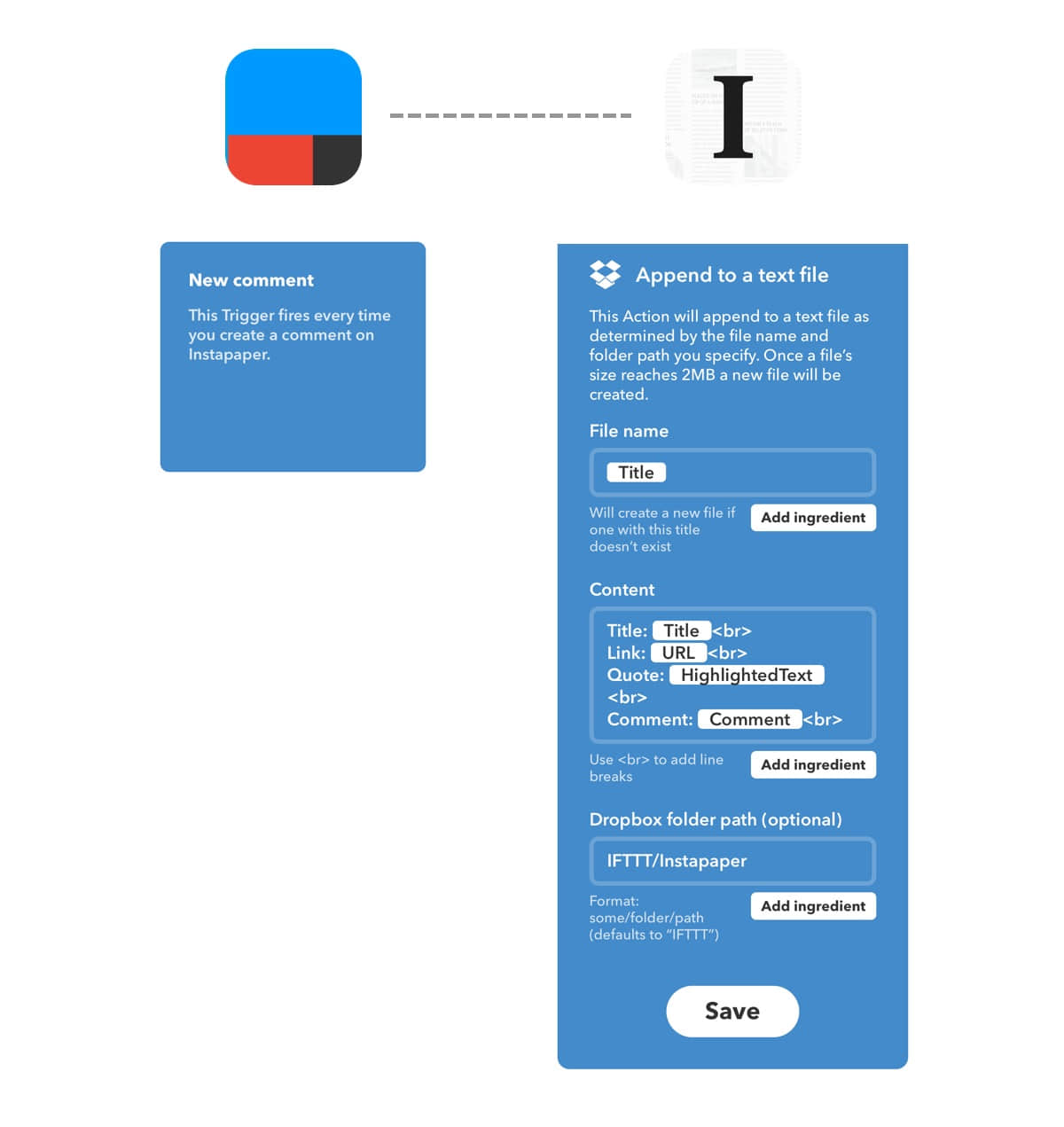 @文刀漢三:这个动作比较棘手的地方在于,Instapaper 无法一次性导出全部注释,因此得借助 IFTTT 来实现批量处理。这里我参考了 Alex 的思路,整个流程大致为:当 IFTTT 检测到 Instapaper 有新的注释(Highlight)或者批注(Comment)时,会自动抓取并保存到 Dropbox 中,如果是同一篇文章,则会保存到同一个文档。然后通过 Workflow 调取 Dropbox 文档进行重排版,最后转换成富文本格式发送到 Evernote 中。 全程需要手动操作的只有运行 Workflow 后选择文件,其它均是自动运行。