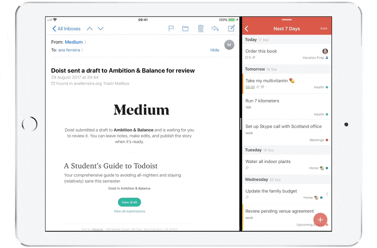 但在 iOS 11,有了 Drag & Drop,各大客户端就都可以把任务拖到任务管理工具里了,其中完成得最理想的是 Todoist: