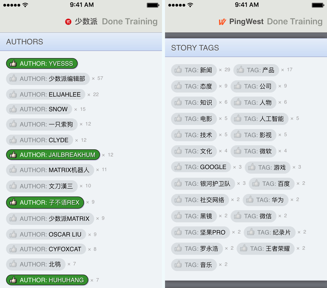 NewsBlur 本身是一个 RSS 订阅服务,此外它也有多个平台的客户端。NewsBlur 最特色是 Training 过滤。它的过滤可以做到过滤文章作者以及文章标签: