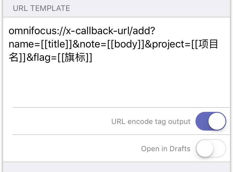最后一步就是打开 URL,我们通过这一步来完成任务的添加。关于 OmniFocus 的 URL Schemes,@Hum 已经写有颇为详尽的文章,我直接借来里面的 URL Schemes 一用: omnifocus://x-callback-url/add?name=任务名¬e=备注&estimate=延续时间&autocomplete=true&completed=预设完成日期&repeat-method=重复形式&repeat-rule=重复规则¶llel=true&flag=true&defer=推迟到…&due=何时到期&project=项目名&context=上下文&attachment-name=附件名&attachment=附件文件
