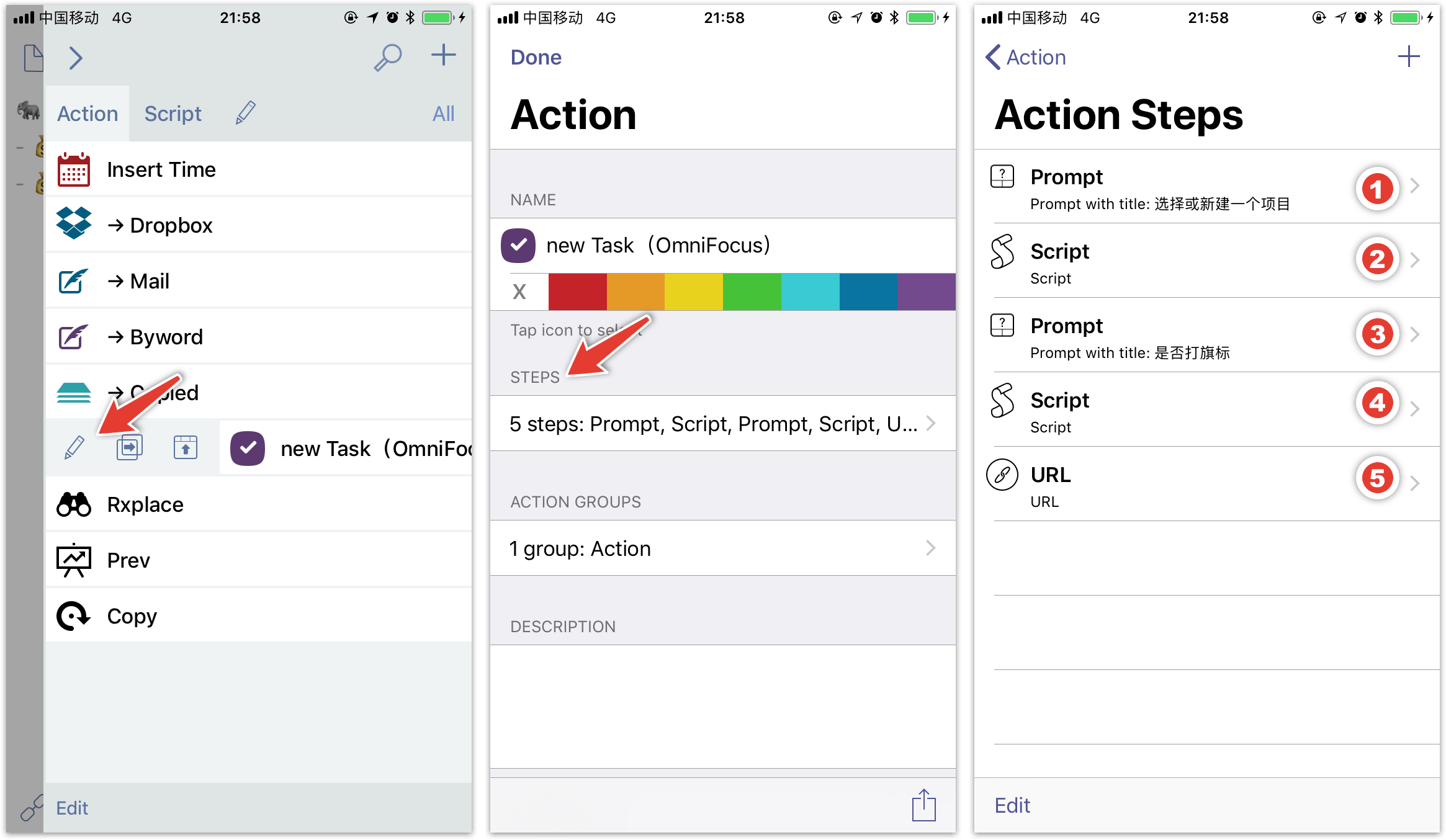 这个 Drafts 动作有五个步骤,用到了两个 Prompt(提示框)、两段 JavaScript 脚本和一条添加任务的 URL Schemes。分开来看的话其实不复杂,你也可以直接把项目、旗标修改为自己想要的内容,应用到自己的任务管理中。