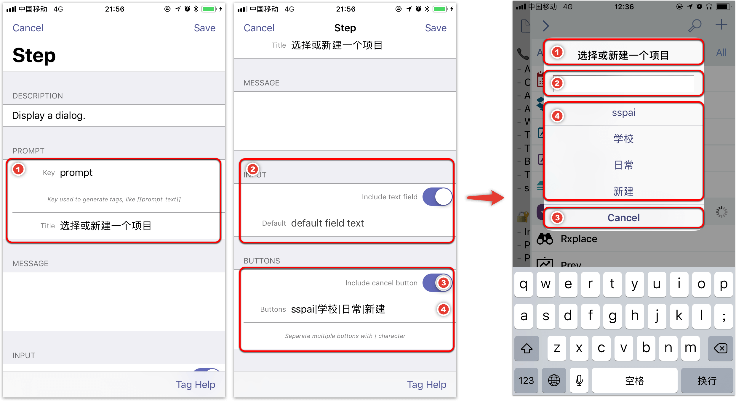 我们先以第一步为例。Drafts 里的 Prompt 有两个作用:按钮和输入,刚好可以满足我「选项目」和「新建项目」的两个需求。下面是具体设置和最终效果的图示: