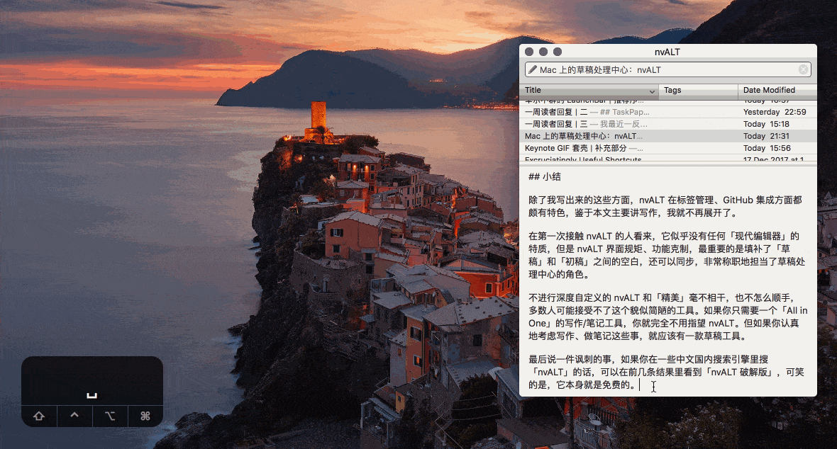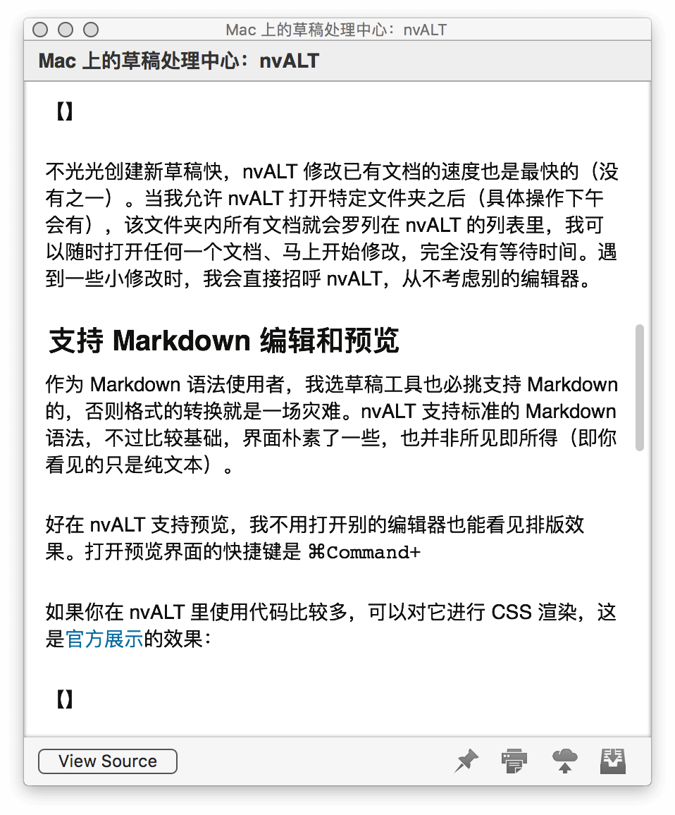 好在 nvALT 支持预览,我不用打开别的编辑器也能看见排版效果。打开预览界面的快捷键是 ⌘Command-⌃Control-P。