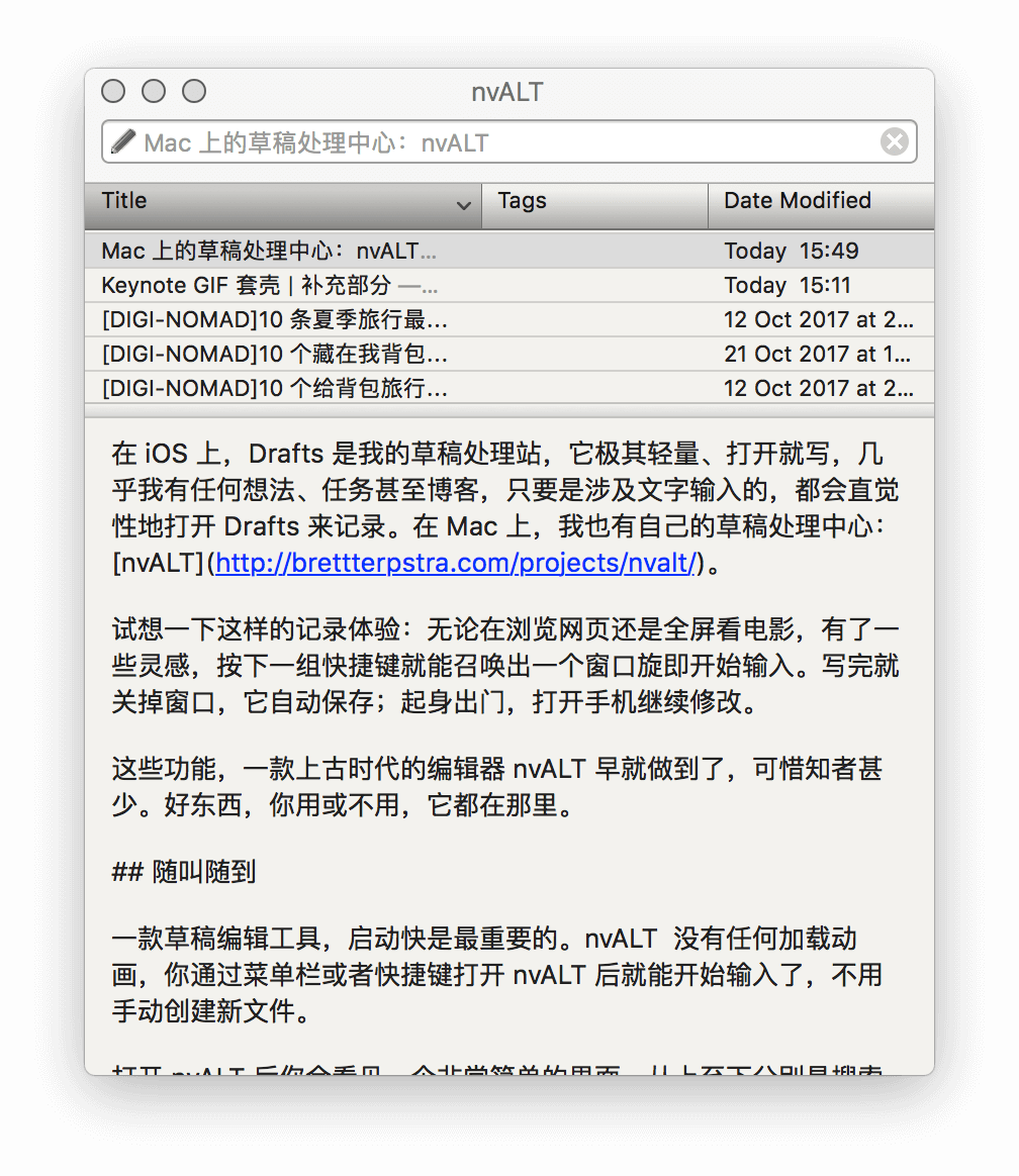 nvALT 有一个特殊的设计,即把搜索和新建结合在一起,每次打开 nvALT 你的光标就会出现在搜索栏里,输入标题后敲下回车就新建一条草稿,光标同时定位到正文开头等待输入;如果在搜索栏里输入的内容已经有了匹配的文档,回车操作就是直接编辑之。这里有一个令人感动的小细节,每次光标都会回到我上次离开对应文档时的位置,我的工作总能无缝衔接。