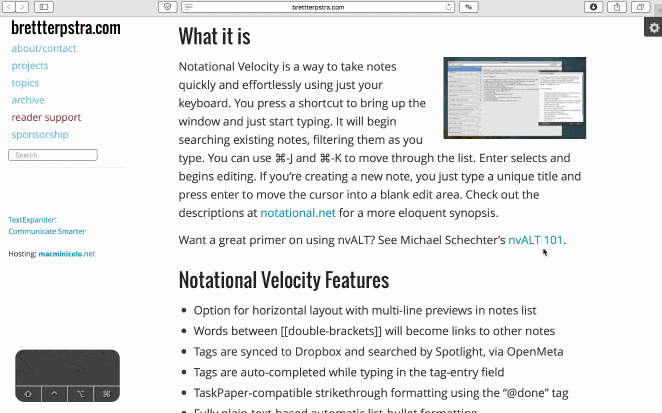 我为 nvALT 设置的启动快捷键是 ⌘Command-⌥Option-N,这和 Copied 的 ⌘Command-⌥Option-B 刚好配成一对,一个管草稿,一个司剪贴。最让我开心的是 nvALT 可以在全屏应用里跳出来,比如全屏浏览网页、看电影或做幻灯片时,不用跳转回桌面。对了,为了达到这个效果,你可能需要点击 nvALT 设置里的「hide dock icon」选项。 除了直接打字,我也常常把网页上的内容直接贴在 nvALT 里,此时就可以使用快捷键 ⌘Command-⇧Shift-V,nvALT 会用摘抄的格式把剪贴板内容站上,让你知道这条内容来自何处,日后做整理回顾非常方便。