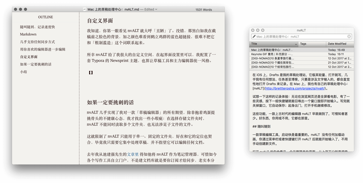 不进行深度自定义的 nvALT 和「精美」毫不相干,也不怎么顺手,多数人可能接受不了这个貌似简陋的工具。如果你只需要一个「All in One」的写作/笔记工具,你就完全不用指望 nvALT。但如果你认真地考虑写作、做笔记这些事,就应该有一款草稿工具。
