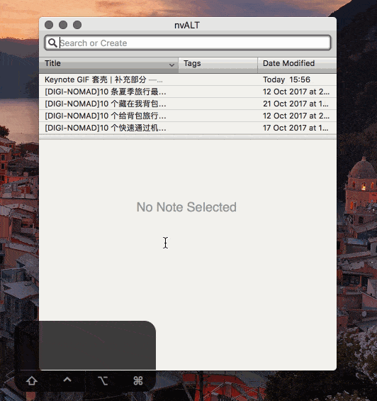 在 iOS 上,Drafts 是我的草稿处理站,它极其轻量、打开就写,几乎我有任何想法、任务甚至博客,只要是涉及文字输入的,都会直觉性地打开 Drafts 来记录。在 Mac 上,我也有自己的草稿处理中心:nvALT。 试想一下这样的记录体验:无论在浏览网页还是全屏看电影,有了一些灵感,按下一组快捷键就能召唤出一个窗口旋即开始输入。写完就关掉窗口,它自动保存;起身出门,打开手机继续修改。
