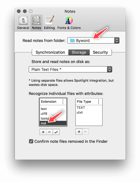 现在的编辑器,没有同步功能似乎就不好意思拿出手,nvALT 内置的同步只支持 Simplenote,但不妨碍它实现更广泛的同步功能。我把它的存储文件夹设置为 iCloud 中的 Byword 文件夹,同时在格式支持里添加一个 .md 格式以便读取 markdown 文件,简简单单就完成了 nvALT 和 Byword 的同步。如此一来,不光能享受同步,还可以直接编辑 Byword 里的文档,非常方便。 如果你使用其他的同步服务(如 Dropbox 和坚果云),只要是在本地拥有同步文件夹的,就可以自行实现同步,在电脑上暂停工作,拿起手机则能够继续编辑。