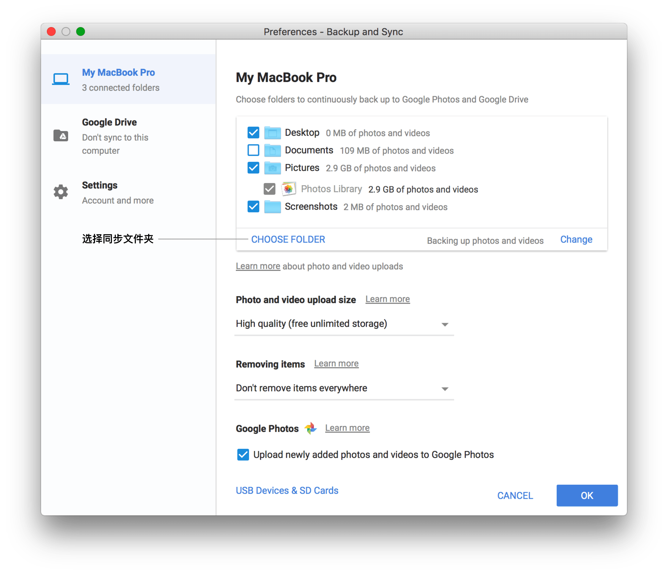 在 Mac 上,Google Photos 没有用于查看图片的 App,但是有一个用于上传图片到 Google Photos 的小插件:下载链接。 这个插件可以让我们选择同步图片的文件夹,所以我们可以把截图文件夹也通过这个插件,上传到 Google Photos 中,对 Mac 上的所有屏幕截图也进行留底。