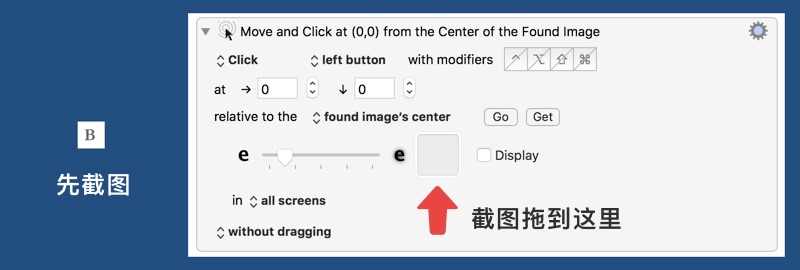 你只需要将想点击的按钮截图下来,并拖进这个动作里,就可以了。图片旁边有一条滑轨,可以调整 Keyboard Maestro 查找图片时的相似程度,我建议可以将相似度往右调低一些,这样会提高搜索的成功率。