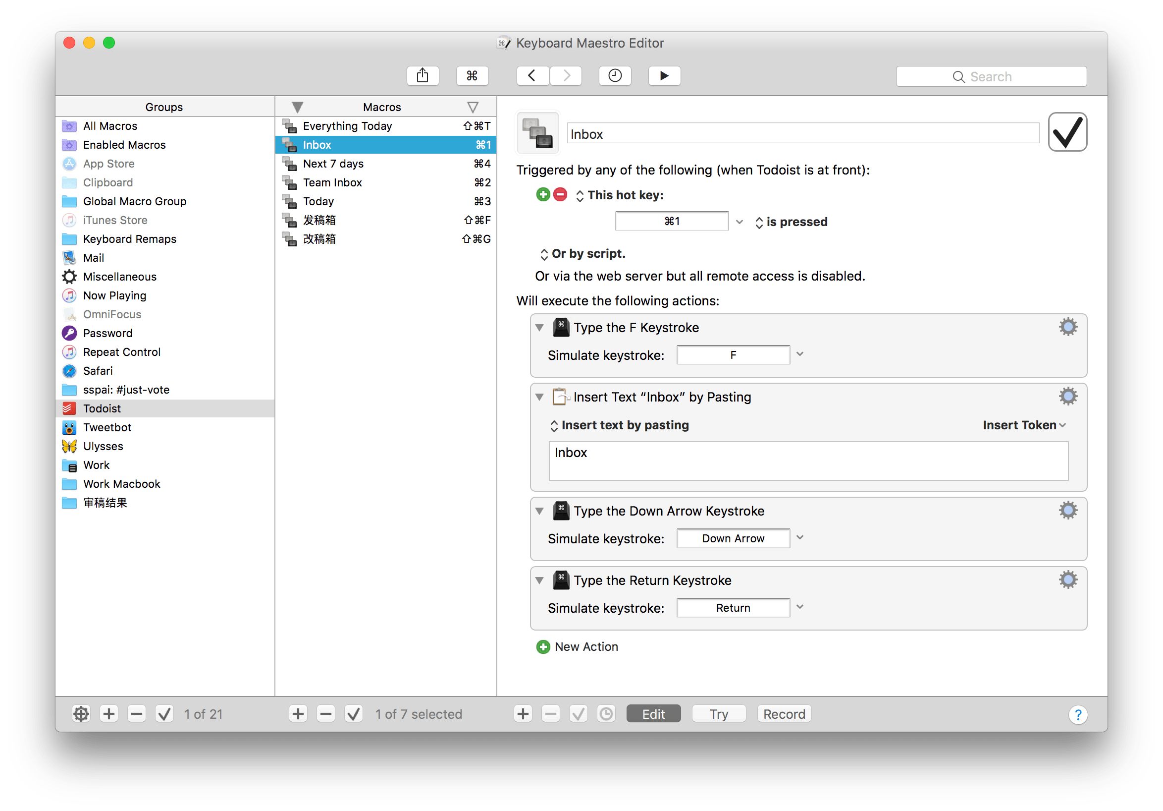 思路主要是借助 Todoist 的搜索功能,然后让 Keyboard Maestro 帮我们一项一项去选择。