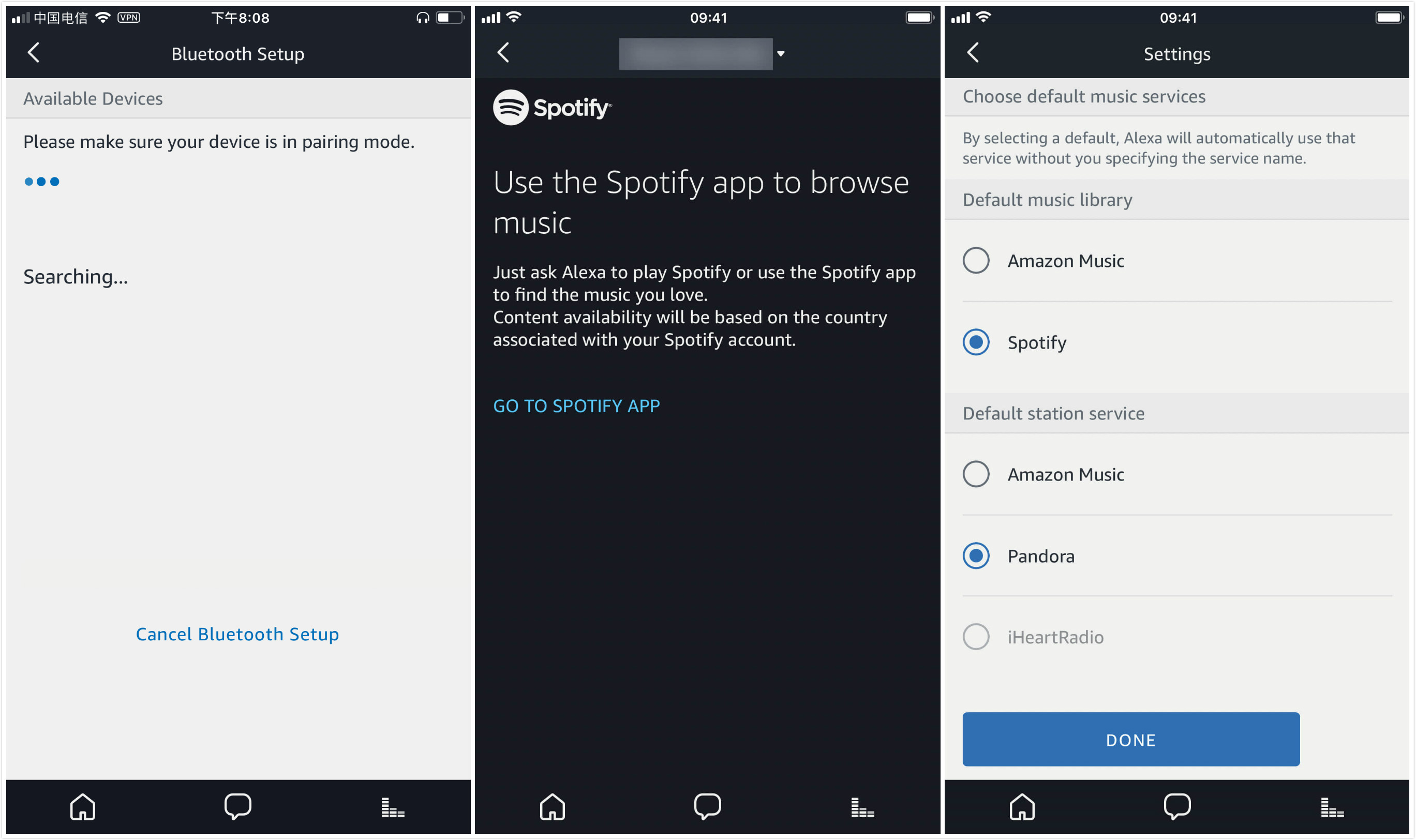 最后也是我最经常使用的功能,就是连接蓝牙音箱,控制 Spotify 播放。第一次配置时,先在 App 里搜索你的音箱,连接成功后,再登录你的 Spotify 音乐账户,把它设为你的默认音乐服务即可。