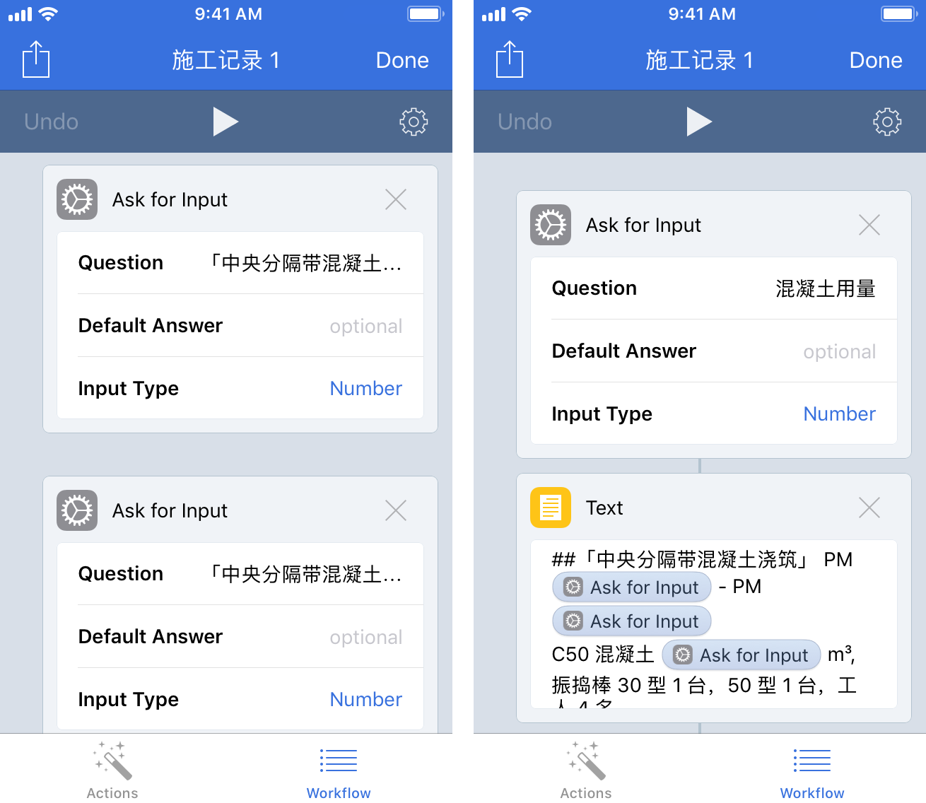 上图是我记录好的一条施工日志。拿图中的「中央分隔带混凝土浇筑」来说,每天浇筑的部位肯定是会变化的,所需的混凝土方量也不同,参与施工的工人人数,大多数时候都是一样的,偶尔可能会有变化。施工所需要的工具(振捣棒)也不会变化,记录时间直接让 Workflow 获取当前时间。因此,只需要把这些会发生变化的部分在 Workflow 中当作变量,依次输入即可。这些变量都是数字,因此 Input Type 选择 Number 在会比较合适,通知中心内也能够直接输入,无需跳转至 Workflow 主程序。