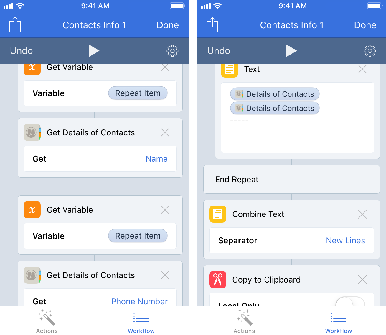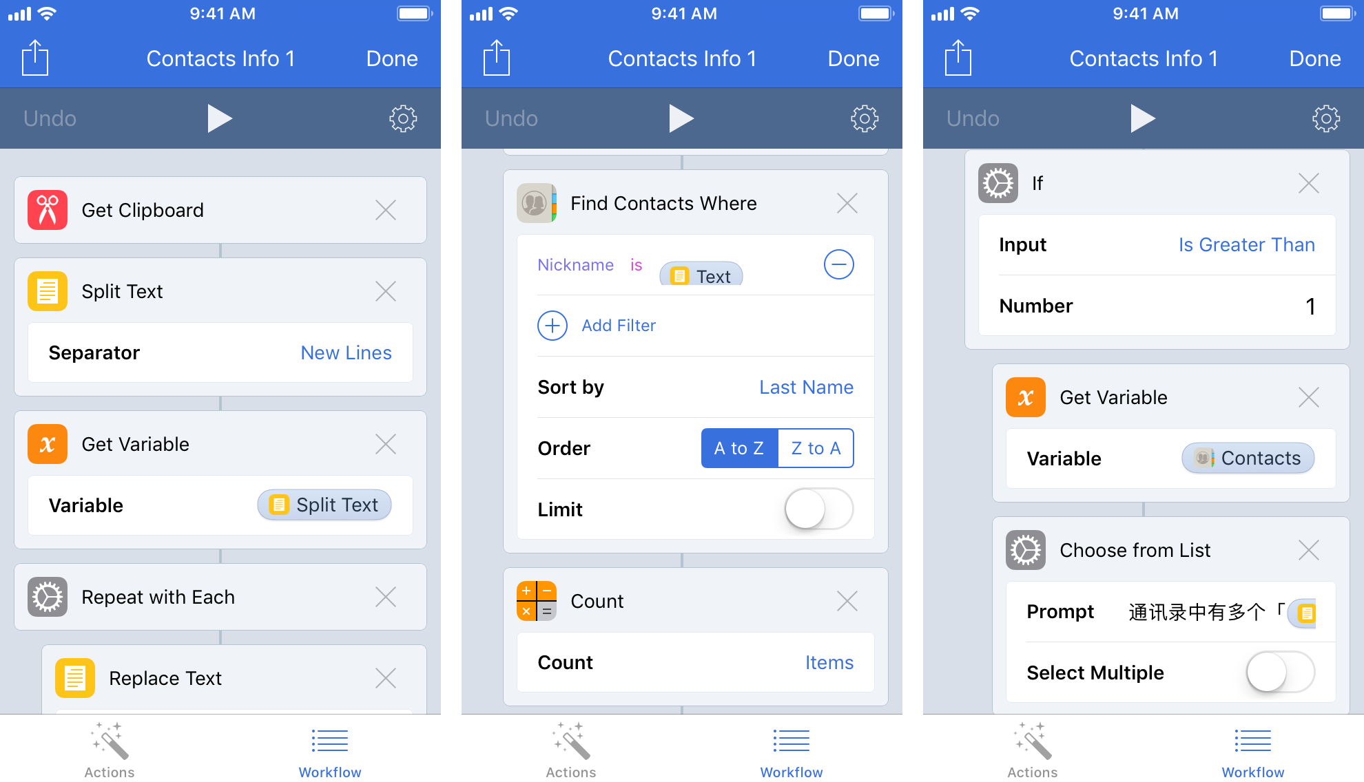 工作中经常需要把张三的联系方式告诉王五,或者需要把张三、李四甚至更多人的号码告诉王五,而张三、李四可能有一个或多个号码。直接对通讯录截图后发送过去,是极其不礼貌的行为,而一个个复制姓名、号码又十分麻烦。用 Workflow 配合其他几样工具,就能很方便得解决上面这一痛点。