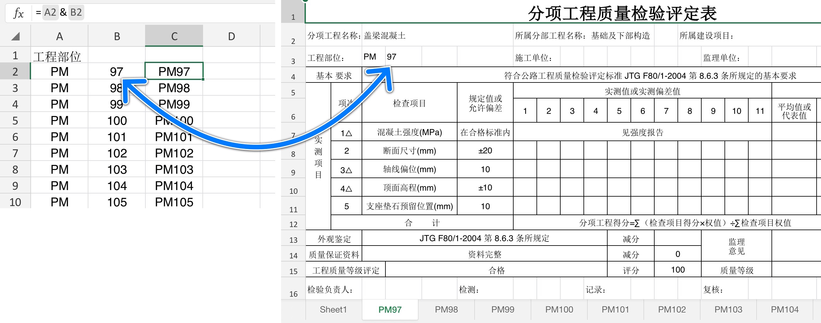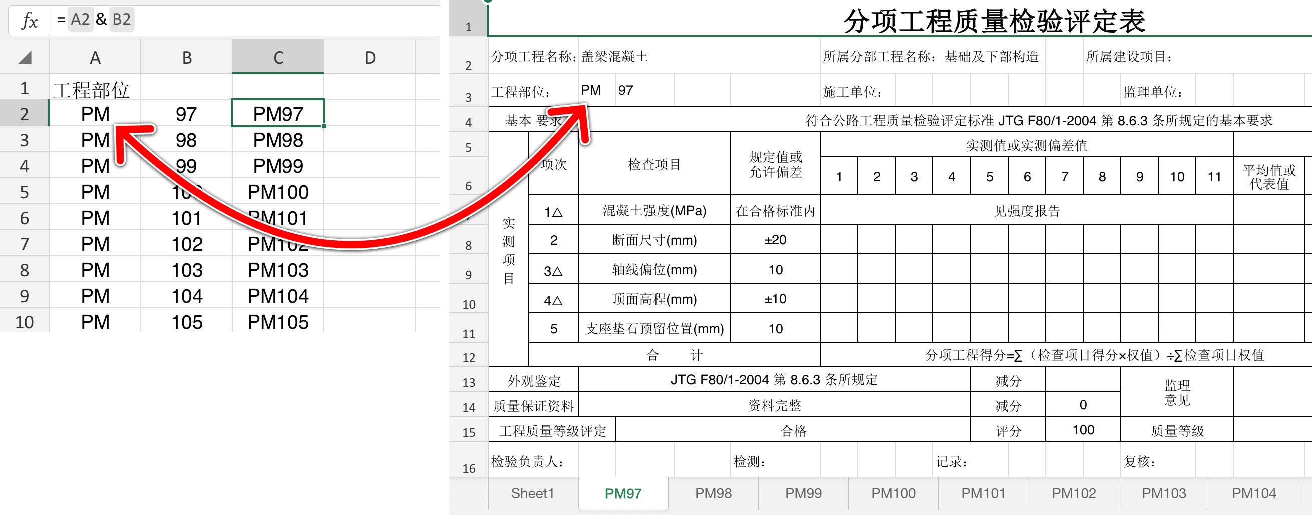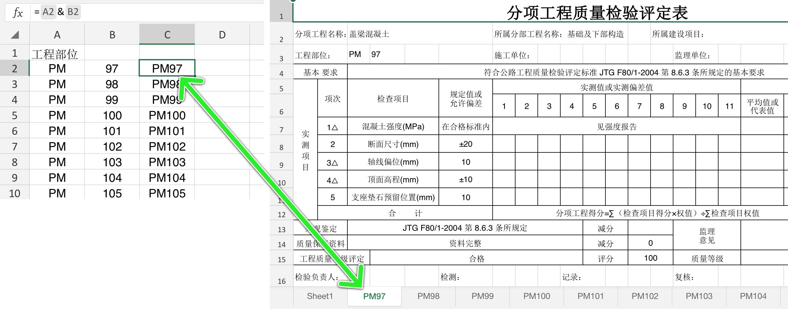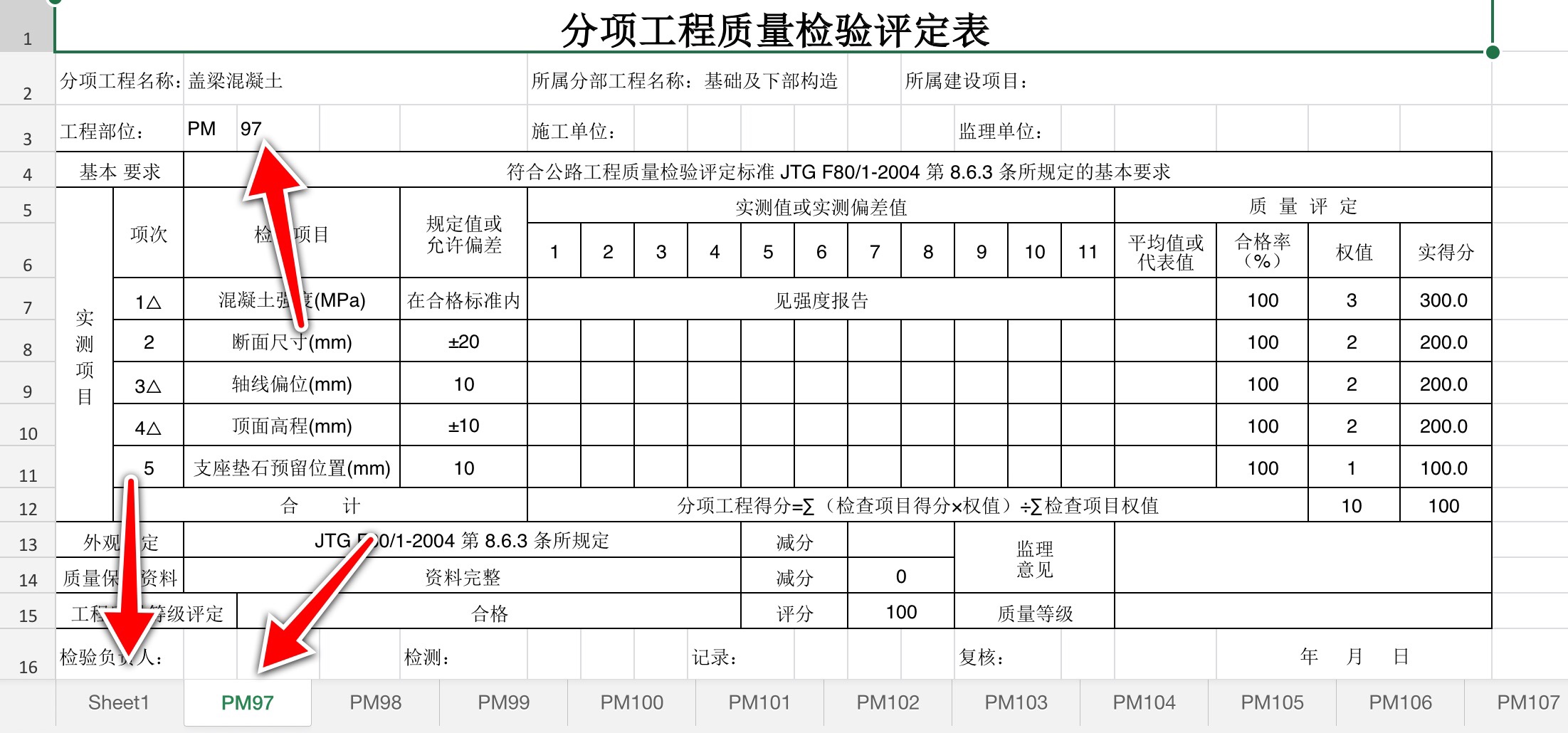 再注意看工程部位,本例中需要从 PM97 一直排到 PM 135。也就是说需要有 39 个工作表,工作表中「工程部位」后面单元格中的数字需要依次增大,同时,每个「工作表的名称」需要以工程部位后面单元格中的数字一致。工作表中其他单元格中的内容则不变。