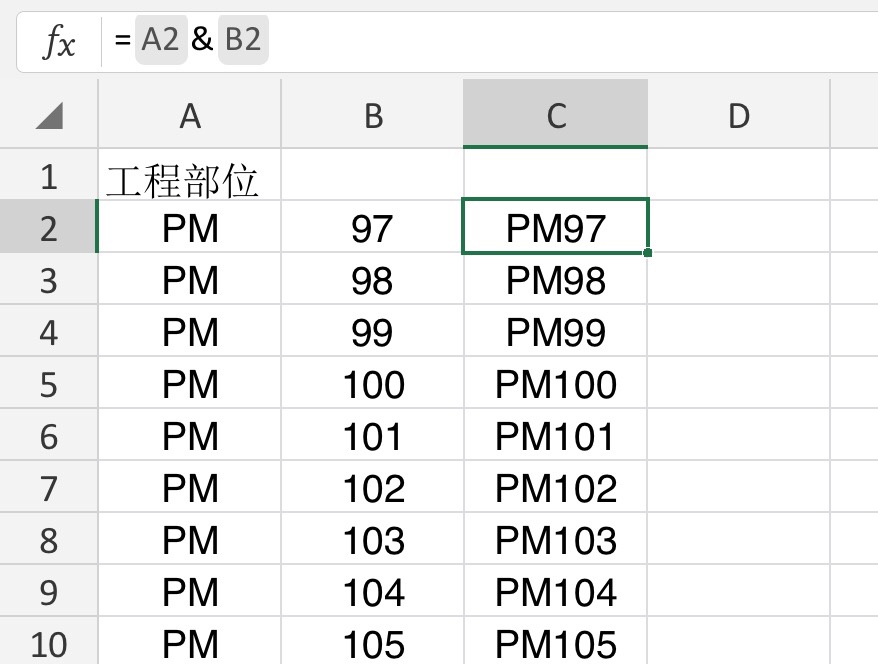 第一列是 PM, 在我们这个工程项目中代表着主线高架桥,其他情况下,可能变成 PJDS, PJDX 等不同的代号;第二列则是墩号,从 97 开始一直到 135; 第三列则是用符号 & 把前面的两列组合起来,形成 PM97 这样的数据。