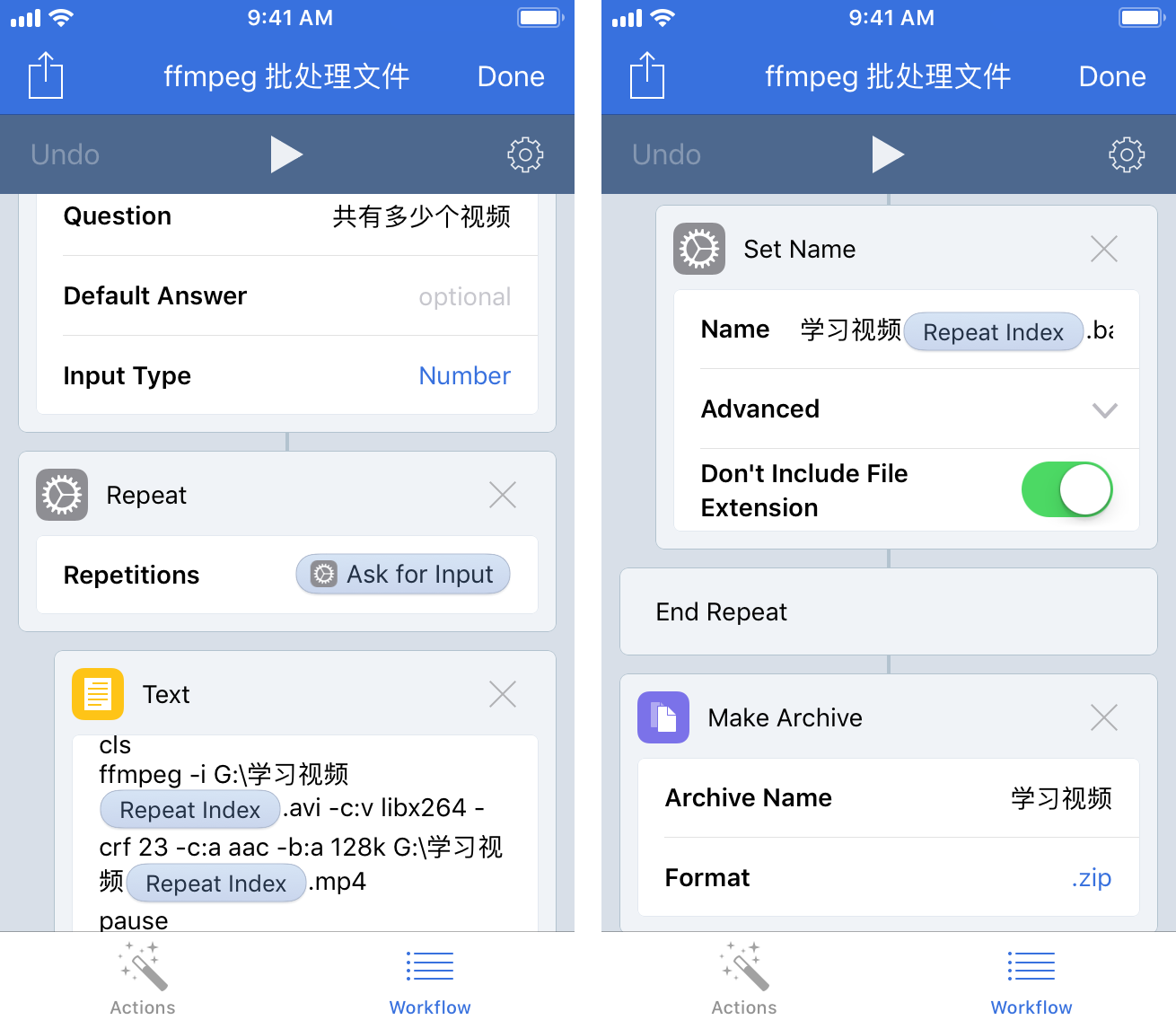 上面那条命令可以直接运行,但教学视频有很多个,逐一把学习视频1中的 1 改成 2, 3, 4 也很费事的,我决定使用 Workflow 为每一个视频生成一个专门的 .bat 批处理文件,双击一下就能转换指定的视频。
