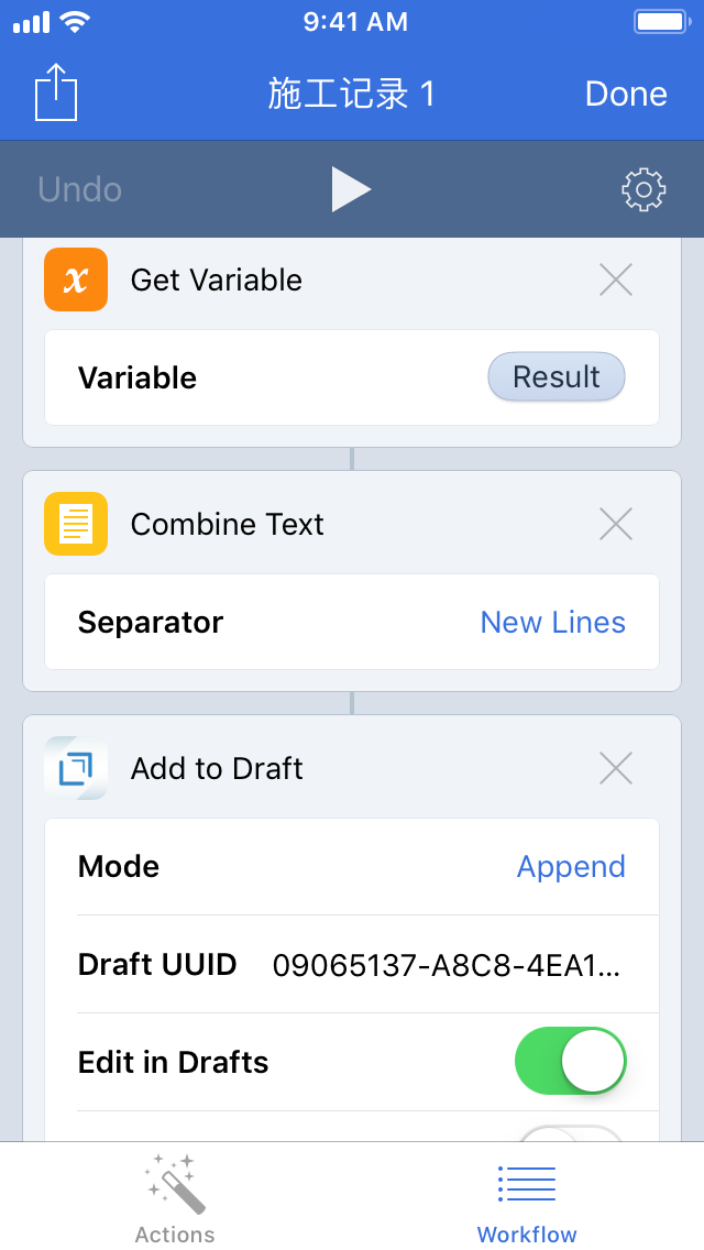 如果想要一次添加多条记录,在 Workflow 开始处加一个 Repeat 就行。最终将一条或多条记录 Append 到 Drafts 的指定条目中即可。