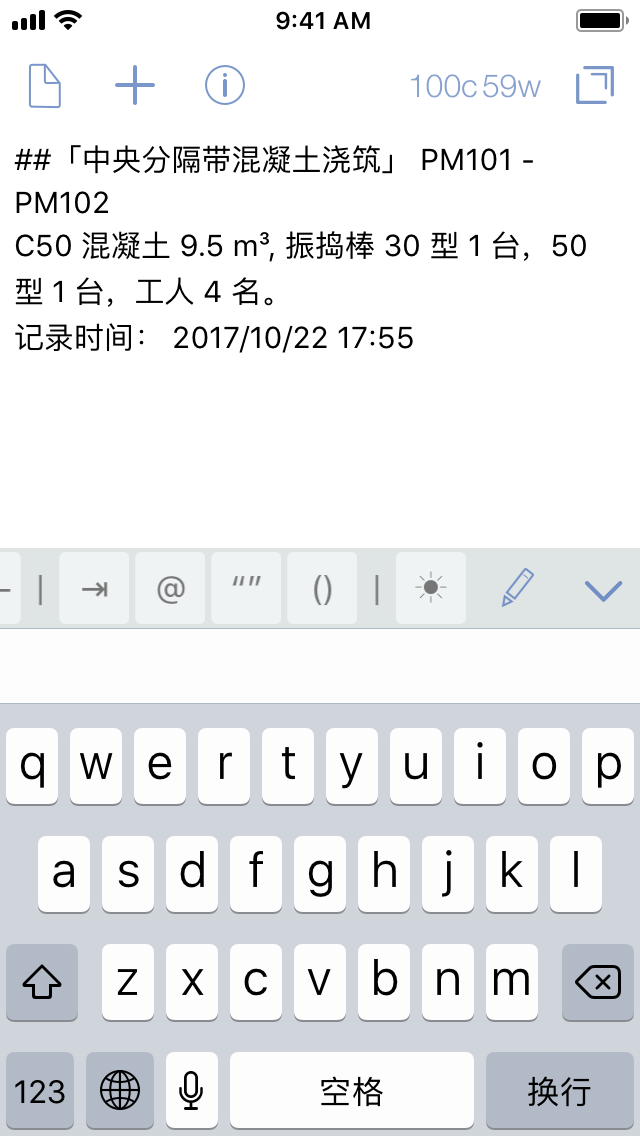 工地上每天干的活儿,都需要记录到施工日志里,后续需要整理、存档。同事们多数用大脑,或笔记本在工地上进行记录,回到办公室再抄写一遍。我总感觉用脑子记会有遗漏,用笔记本在现场进行记录效率不高,后续整理也不方便。我管理的这一片工作,种类较多,但工作内容都相对比较固定,最终我决定用 Workflow 来进行施工日志的记录。