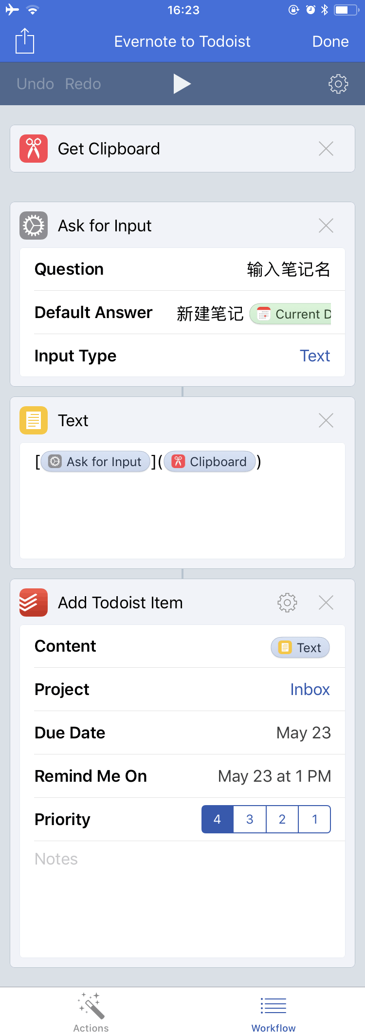 @Minja:虽然 Workflow 不能做到「移动光标」,但我们不妨换个思路,直接在 Workflow 里输入好任务名,再把链接、任务组合起来添加进 Todoist。最终能实现这样的效果:在 Evernote 里生成一条笔记的链接,呼出 Widget、运行 Workflow 即来到文字输入界面,输好、确认任务名后便自动往 Todoist 里添加了任务。