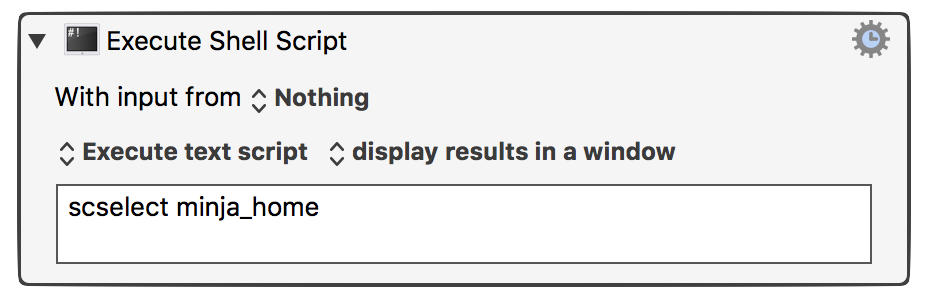 由于家里的路由器配置和在外面不一样,这两步 Action 就非常必要,不然上网就不愉快了。修改网络位置用 shell script 就可以,Keyboard Maestro 内置了相关 Action,添加后填入一条简单的命令。