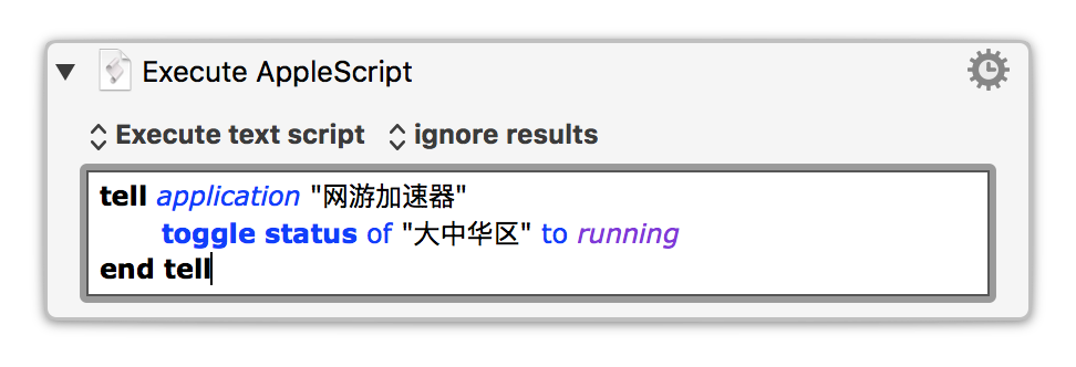 而「网游加速器」情况稍有不同,像我用的这个古董版本,就需要通过 AppleScript 一五一十地告诉它该干什么。