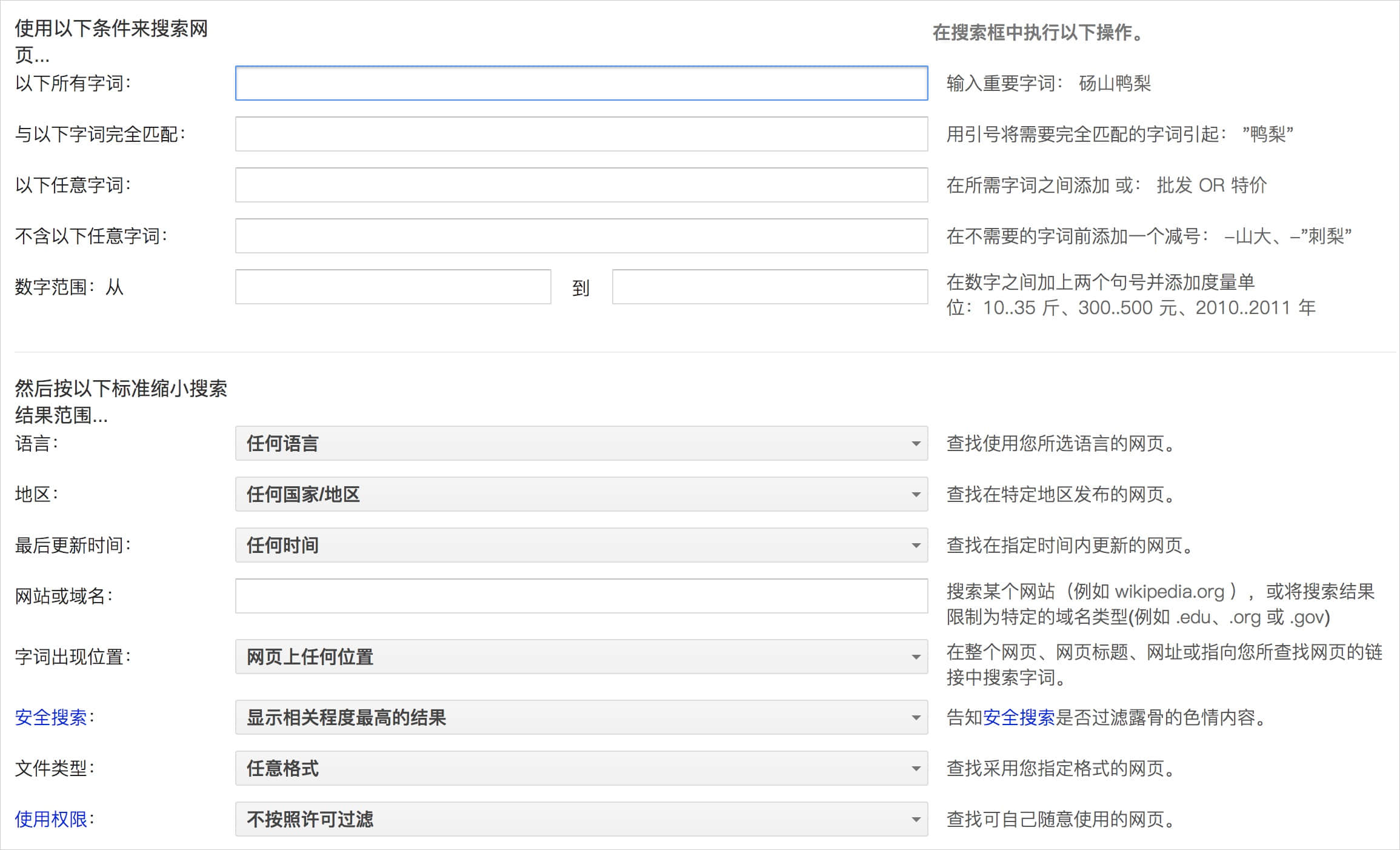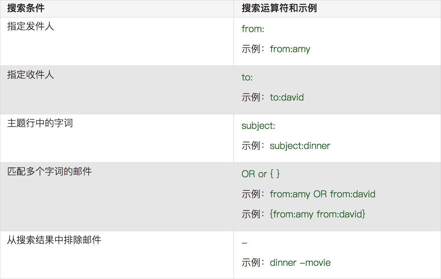 前面两者由于是网络服务,所以可以提供完整的搜索条件页面,但是有很多软件介于服务和应用之间,比如 Gmail 和 Evernote,它们很难直接提供一个搜索条件页面,这时候的一个补救措施,就是搜索语法。