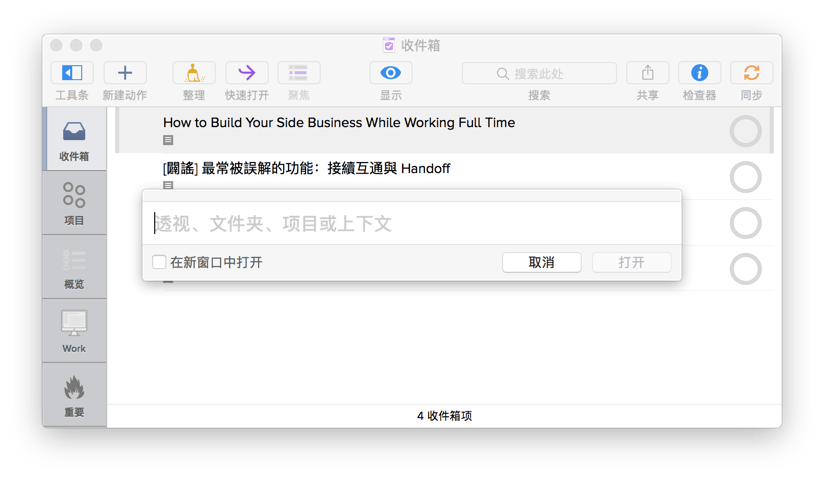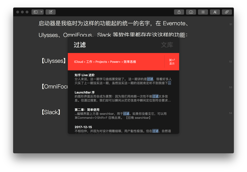 启动器是我临时为这样的功能起的统一的名字,在 Evernote、Ulysses、OmniFocus、Slack 等软件里都存在这这样的功能: