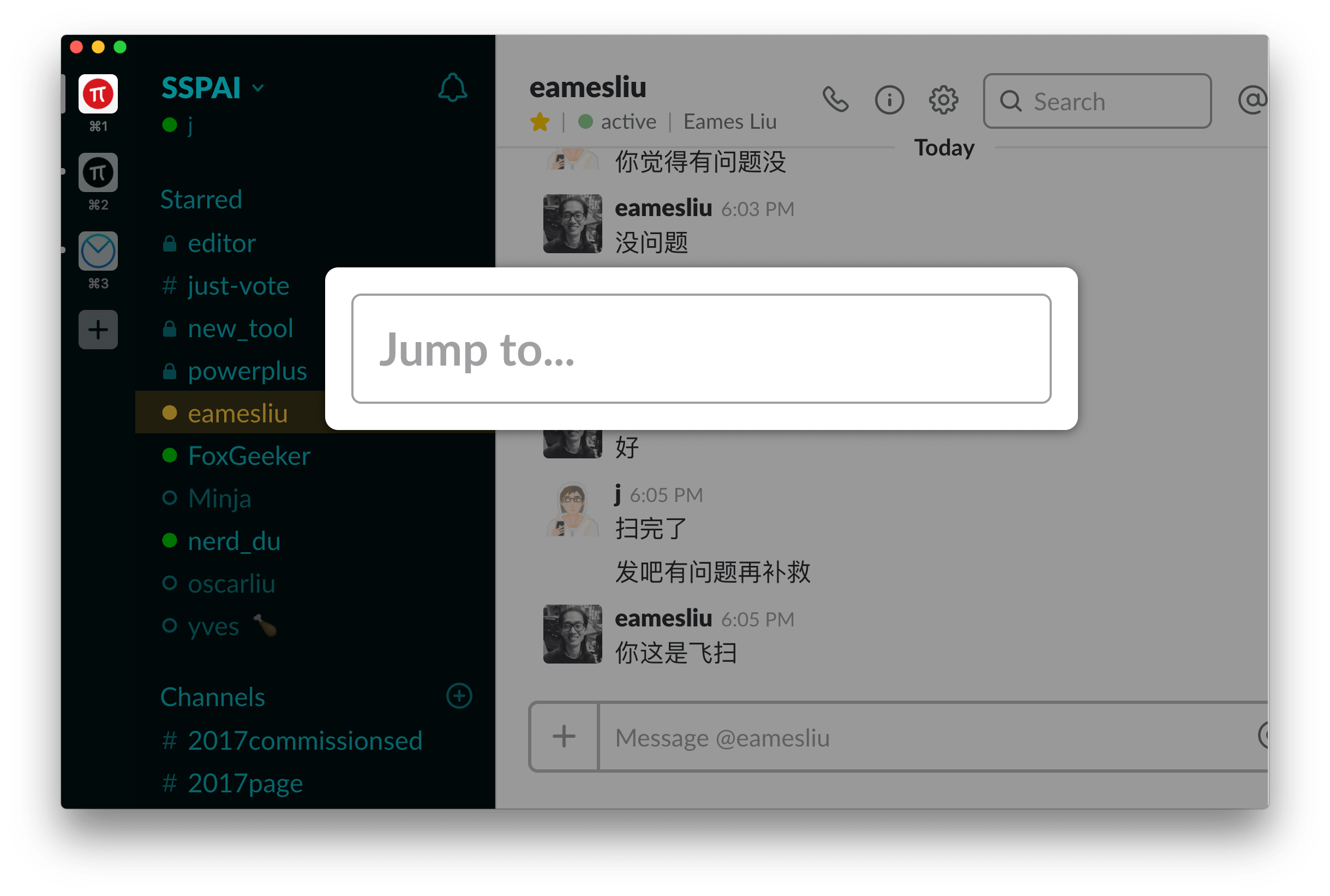 很多工具对这个功能进行了一些特殊的改良,比如在 Slack 里(快捷键是 ⌘Command-K),它会自动把未读的信息排在上面,不知道能节省多少操作的时间。