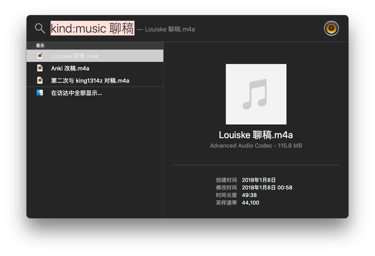 但是有没有做得到位的呢?有,macOS 就把高级搜索语法做到了 Spotlight 里(文档页)。 通过搜索类型和关键字,我把搜索结果极其精确地缩小到了几个聊稿录音中。