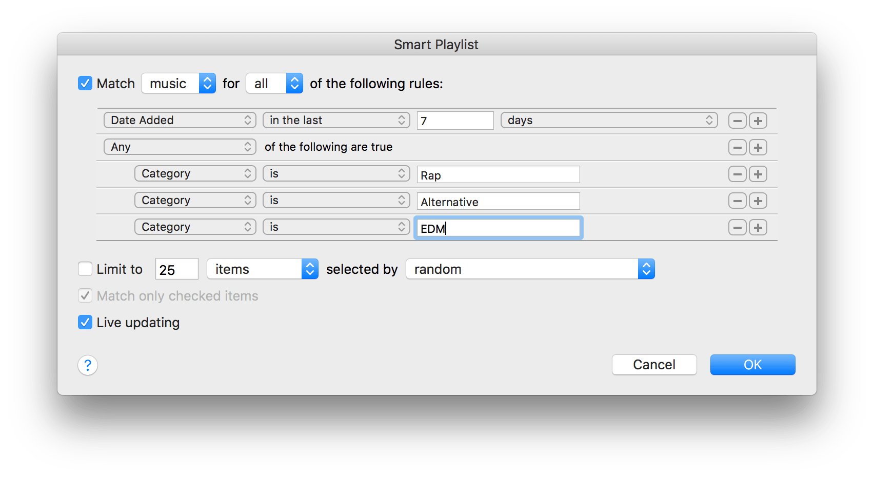 如果你和我一样之前没有意识到这一点,很有可能是因为被过滤的图形界面给迷惑了。图形界面将搜索语法中的运算符改为了一个个的选项,关联就没有直接从搜索到搜索语法那么紧密,但如果我们仔细看,还是可以看出端倪。比如我想用一个 Smart Playlist 把我最近在 iCloud 里添加的 High 的音乐笼到一起,它的条件基本是这样的: