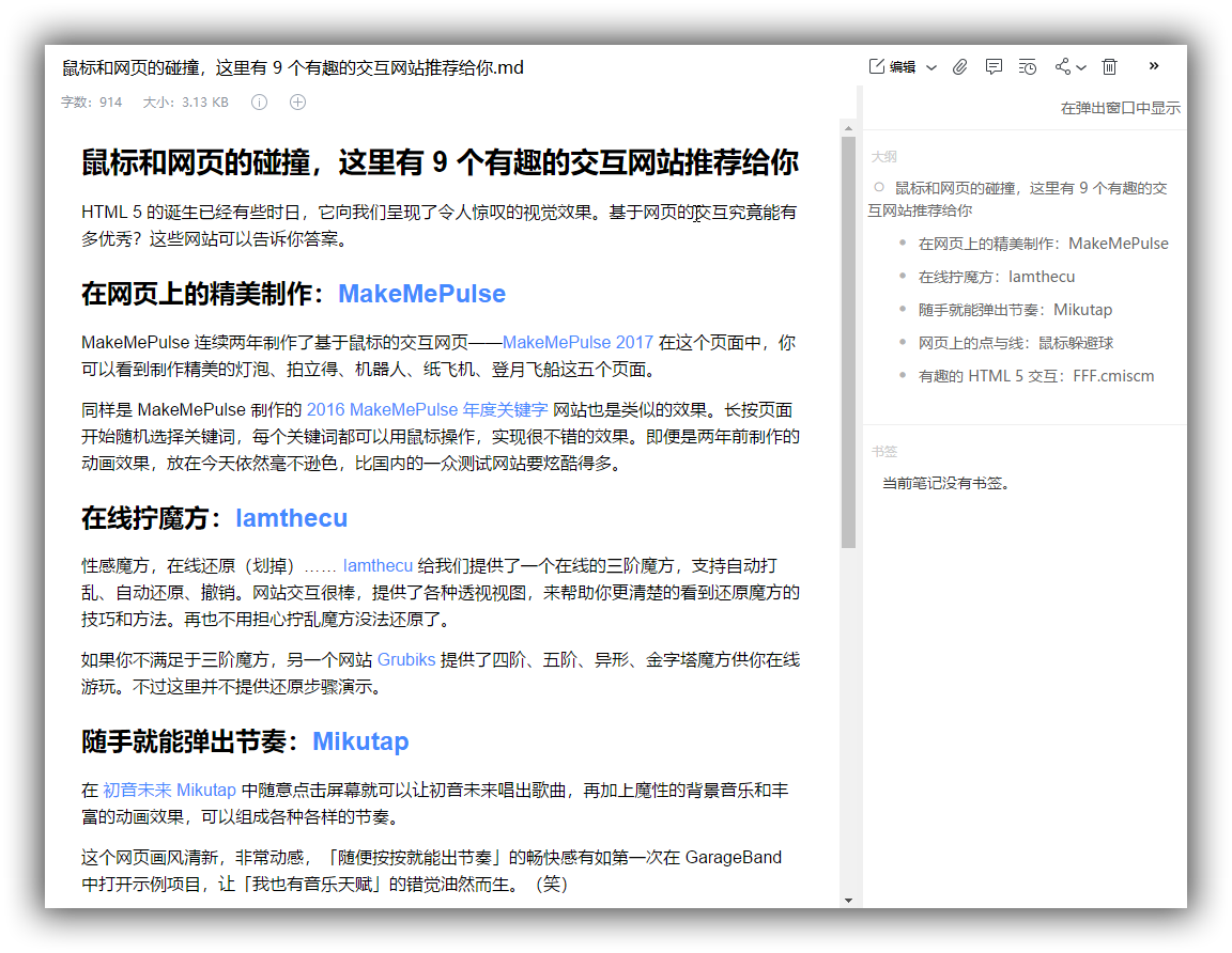 在之前版本中被移除的「新窗口打开笔记」的菜单功能也终于回归,还加入了将「文章大纲固定在右侧」功能,使得文章的大纲更清晰易读。这一点着实让至今都还没有支持 Markdown 的印象笔记汗颜。