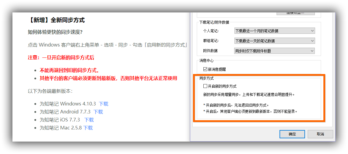 为知笔记还新增了全新的同步方式,可以享受更快的同步速度。需要将其他平台的客户端更新到最新的版本,这个功能需要手动开启且无法回退,如果很在意同步速度可以尝试一下。