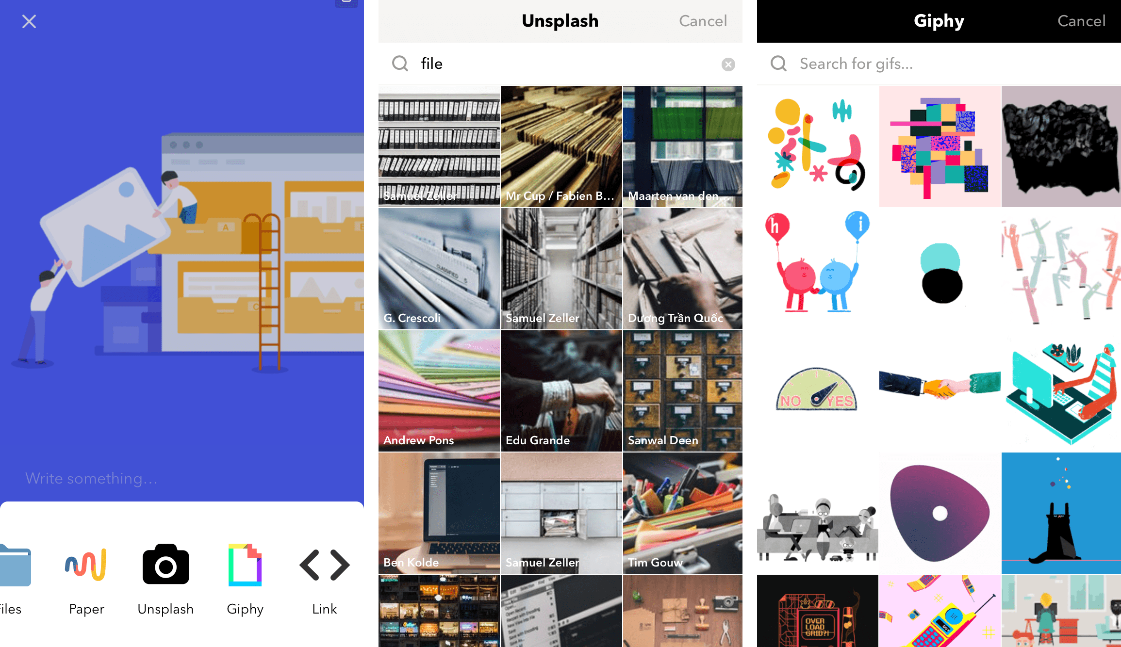 @Minja:在我看来,做幻灯片最大的问题是「找素材」和「排版」上,Paste 一经发布就基本解决了后一个问题,而现在,它把箭头指向了幻灯片素材的搜集。在 1.1.0 版本里,Paste 内置了 Unsplash 和 Giphy 两大图片库,包罗大量的「无版权」动图和静态图片,无需离开应用就能搜索、插入图片供自己的幻灯片使用。 类似的功能我们早已在 Office 中看到,在引入 Store 之后,在线图片搜索功能就以插件的形式存在于 PowerPoint 中(你还可以搜索表情包)。但是其他幻灯片制作工具迟迟未跟上 PowerPoint 的脚步,甚至 PowerPoint 的用户也不见得了解这个功能,最后我们看到的情况是,许多学生、上班族在答辩、会议的前一晚还奋战在「某度图片」里。如果我们仅仅需要一些起到美化作用的图片,这番大费周章就显得很不划算。Paste 在应用内集成两大图站的做法是非常明智的,你可以轻松获取所需图片,还不用担心版权问题。