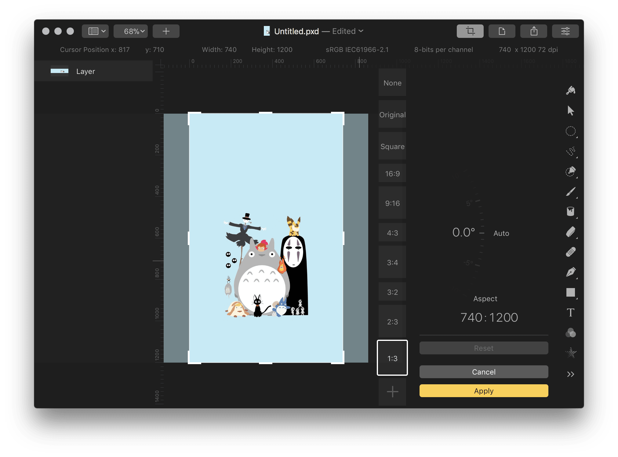 像是「新建一张 1440*480 的画布」或「创建一个正方形的选区」,在 Photoshop 里非常卡顿,以至于业内人士常常建议关闭所谓的「自定义模板」,老老实实手动输入数据。每每这时我就如鲠在喉,接下来的工作也变得很不自在。而在 Pixelmator 这里,这些操作变得非常轻松,就像在使用一个原生的工具。