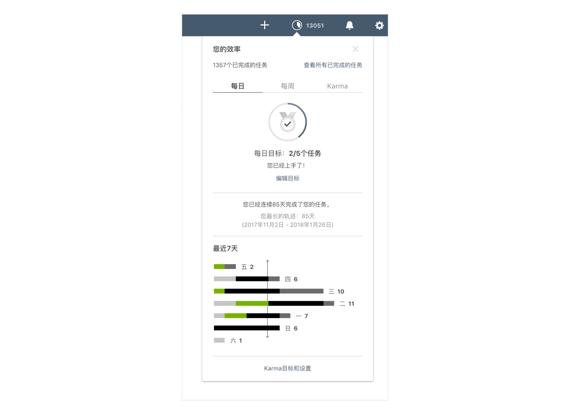 但是前几天看到这版更新后,我尝试设置目标使用了几天,有了一些新想法。比如我在今天下午发现自己只完成了 2 个任务,这能反映出:1. 我今天可能比较闲;2. 我今天可能效率比较低。
