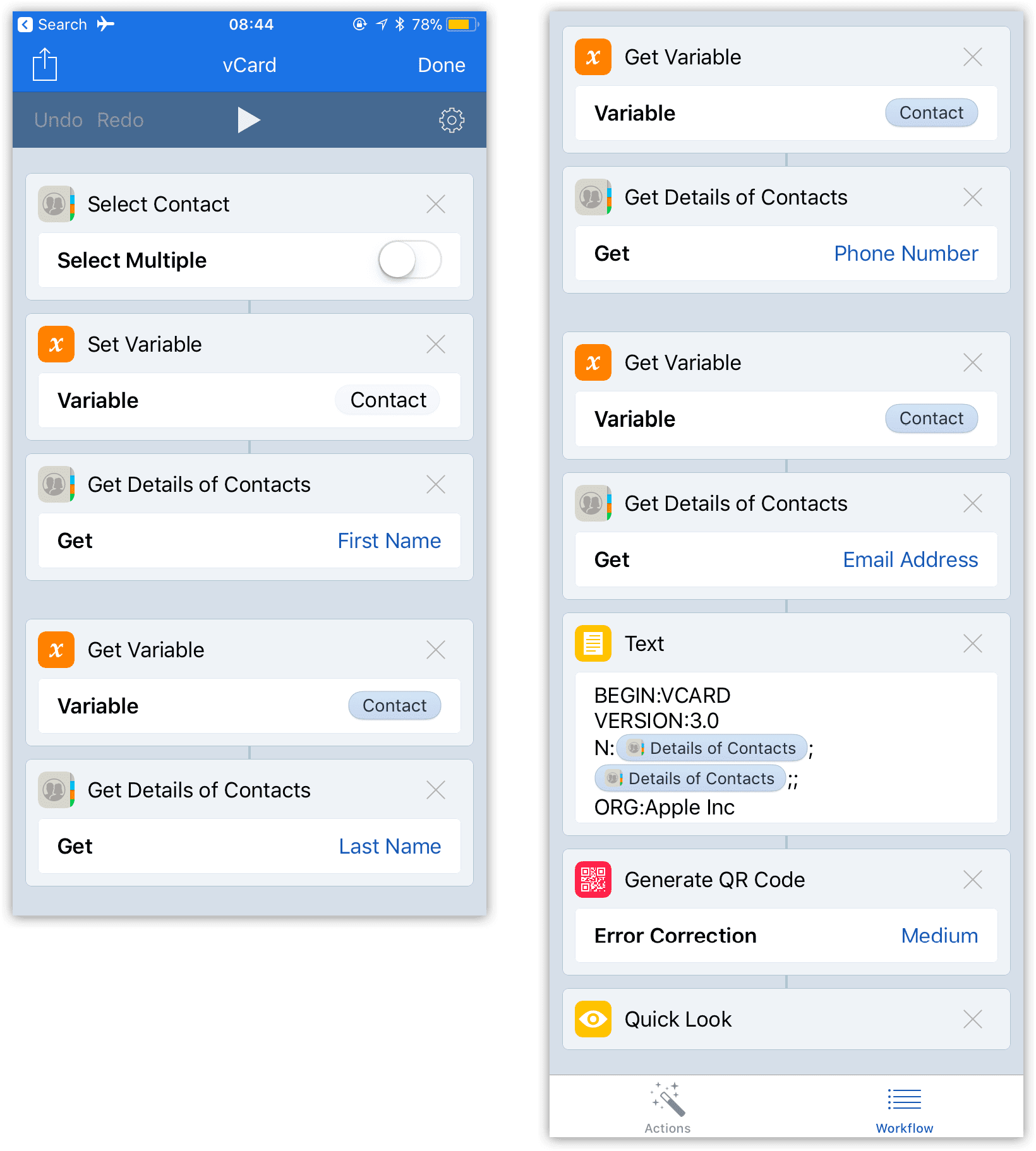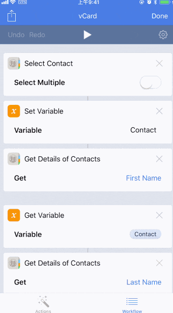 知道了原理后,制作其实非常简单,就是把联系人信息分门别类填进 vCard 格式的文本中在生成二维码。我选择用 Workflow 来制作一个自动化动作,可以每次选择不同的联系人生成二维码名片。这个 Workflow 大致分为两大部分: