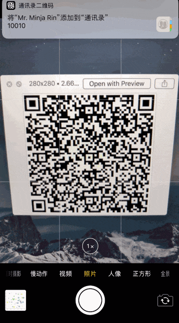 这就是 vCard(Versitcard,电子名片)1 在二维码中的应用,目前所有 iOS 11 设备都支持直接扫码添加联系人,Android 可能需要安装一些应用来实现(我使用的是 Barcode Scanner)。 原理