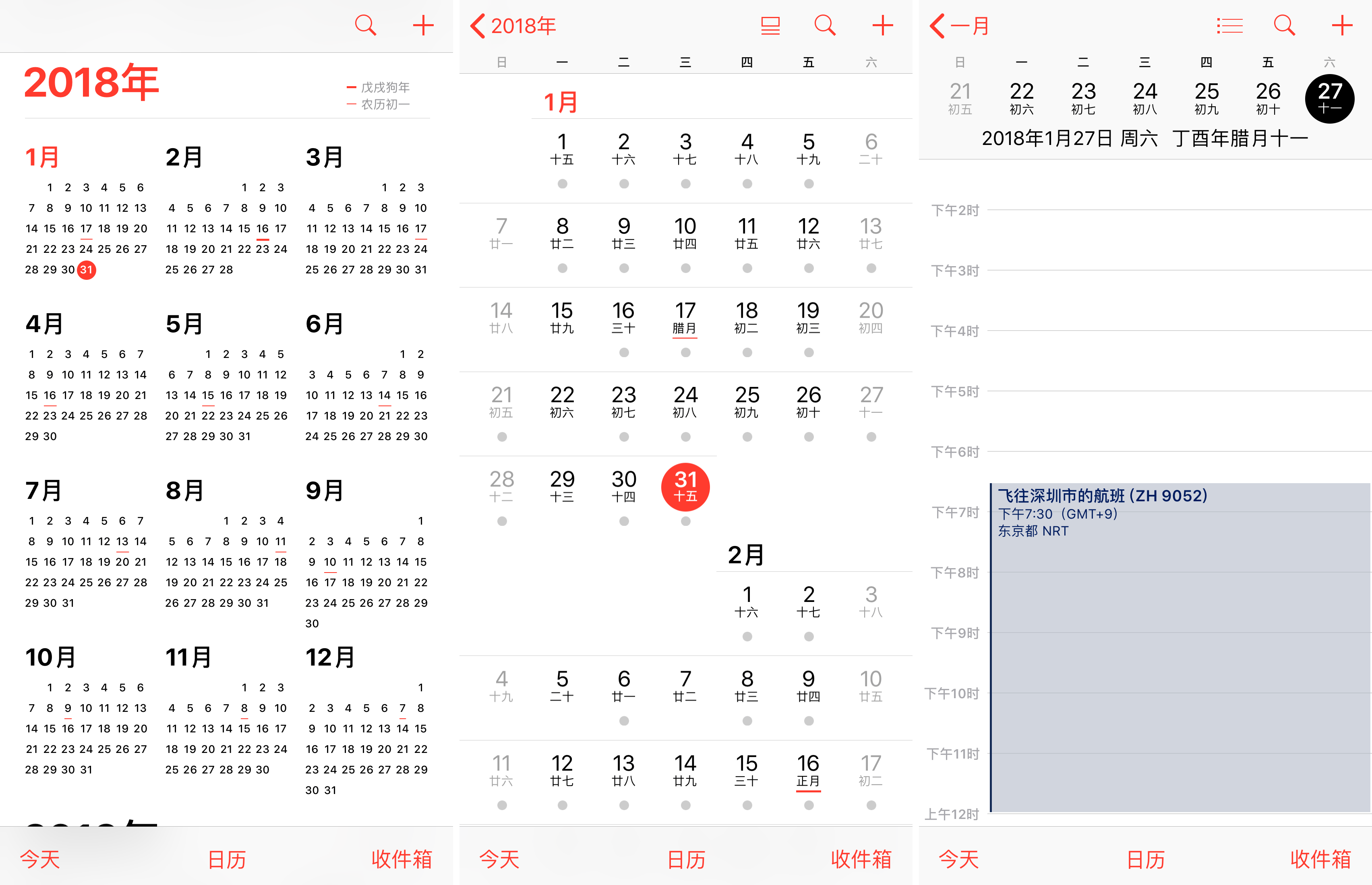 当然,原生日历在视图、设计方面有一些让人眼前一亮的地方,前面提到的周视图中的小细节就是一处。此外,原生日历的各个视图都可以让我们查看农历(需要在设置-日历-其它历法中设置),这就是其它不以中国市场为重心的日历工具很难做到的。日历图标能显示今日日期,也是其它客户端无法做到的。
