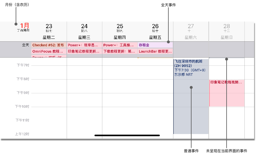 日期在图里只是被淡化的小字,远不如日历事件明显。而且因为这种列表视图会把无事件的日子跳过,导致我一看到这个列表就焦虑,感觉自己怎么这么多事,但实际上事件之间有可能会间隔很多天。