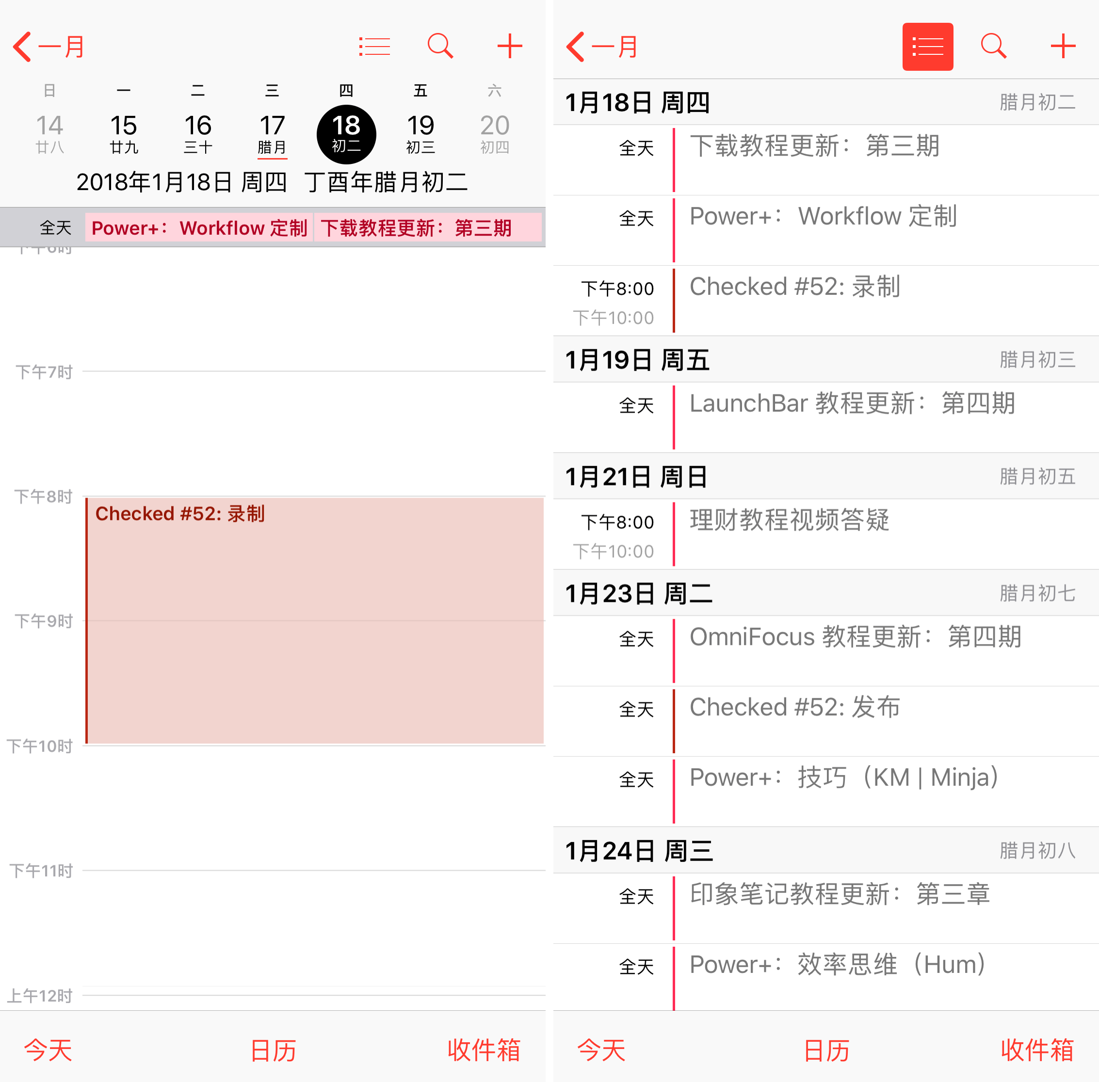 除了以时间划分的视图之外,目前不少日历工具都会有一个事件列表视图,iPhone 原生日历也不例外,在屏幕的右上角用形象的列表符号体现了列表视图,轻触这个按钮就可以在日视图与列表视图之间切换: