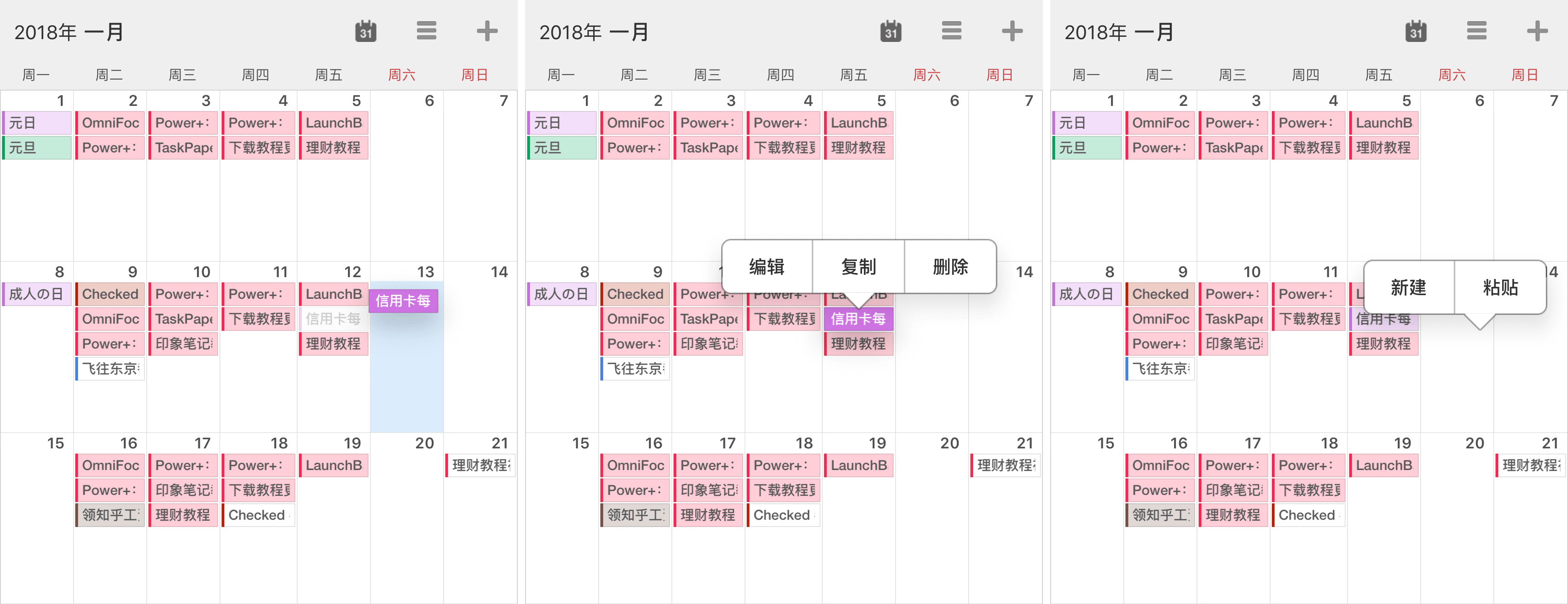 在这些场景,做的最好的是 Calendars 5,在它的月视图中,事件可以任意拖拽,长按一个事件,会弹出一个小菜单,其中有「复制」,选择「复制」后再长按一个新的日期,就能看到「粘贴」按钮,可以把事件粘贴到相应日期。