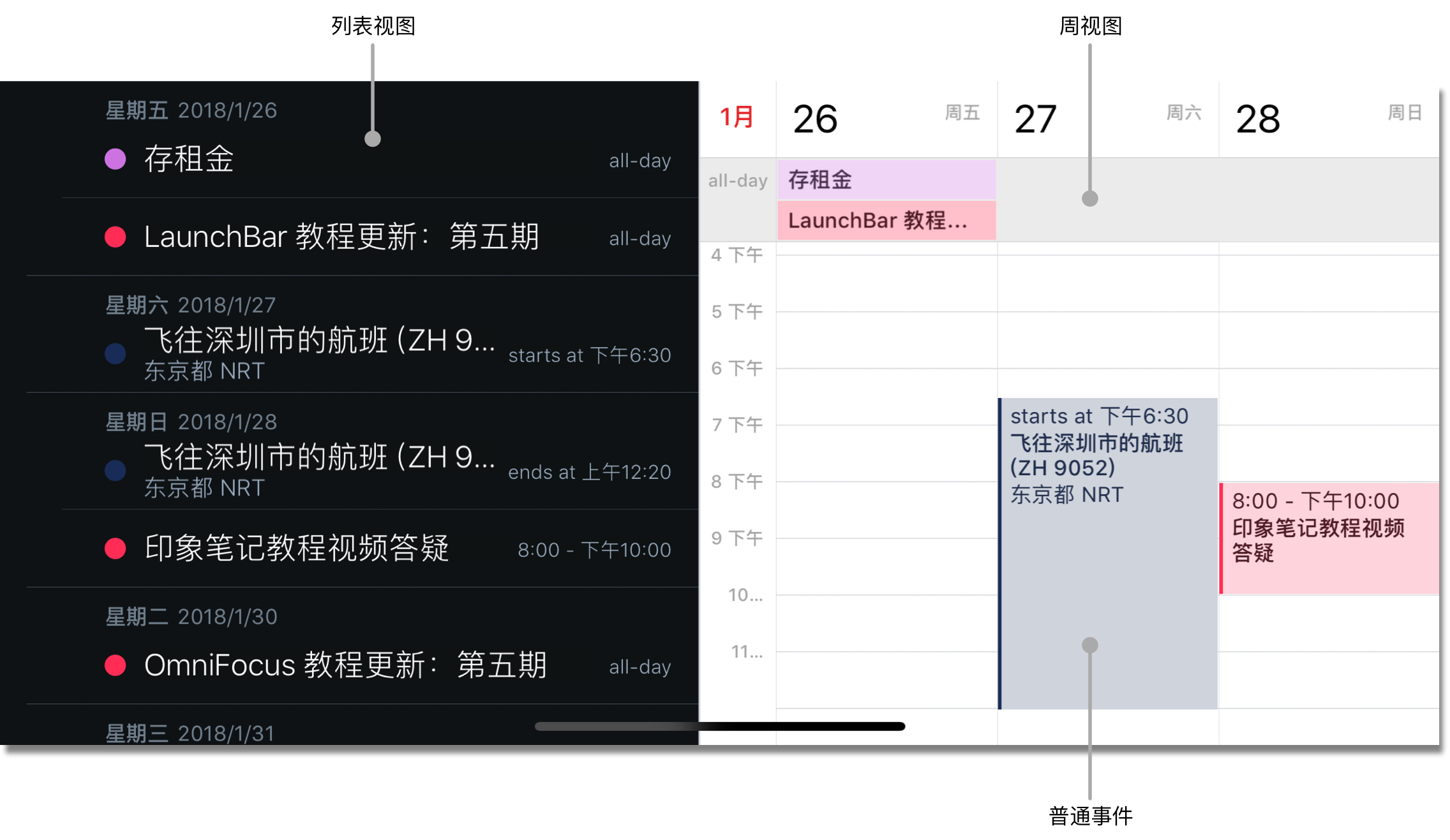 最后在日视图和列表视图方面,也没有特别出彩的地方。