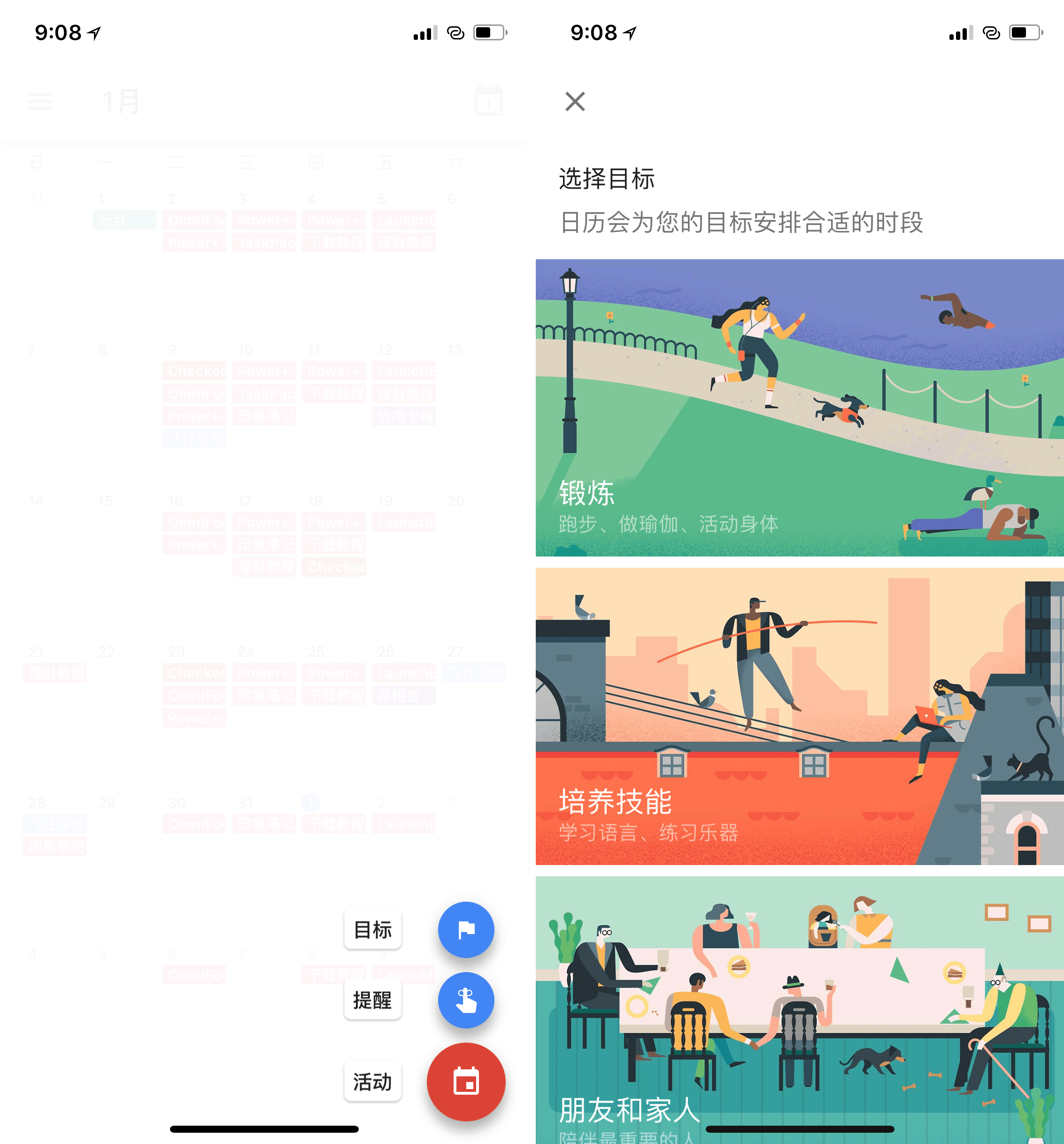 在 Google Calendar 里,添加内容的种类除了一般都有的「活动」和「提醒」之外,还有一个「目标」。这个「目标」里包含了「锻炼」、「培养技能」、「规划生活」等需要周期进行,坚持下来后就可以提高生活质量的模块: